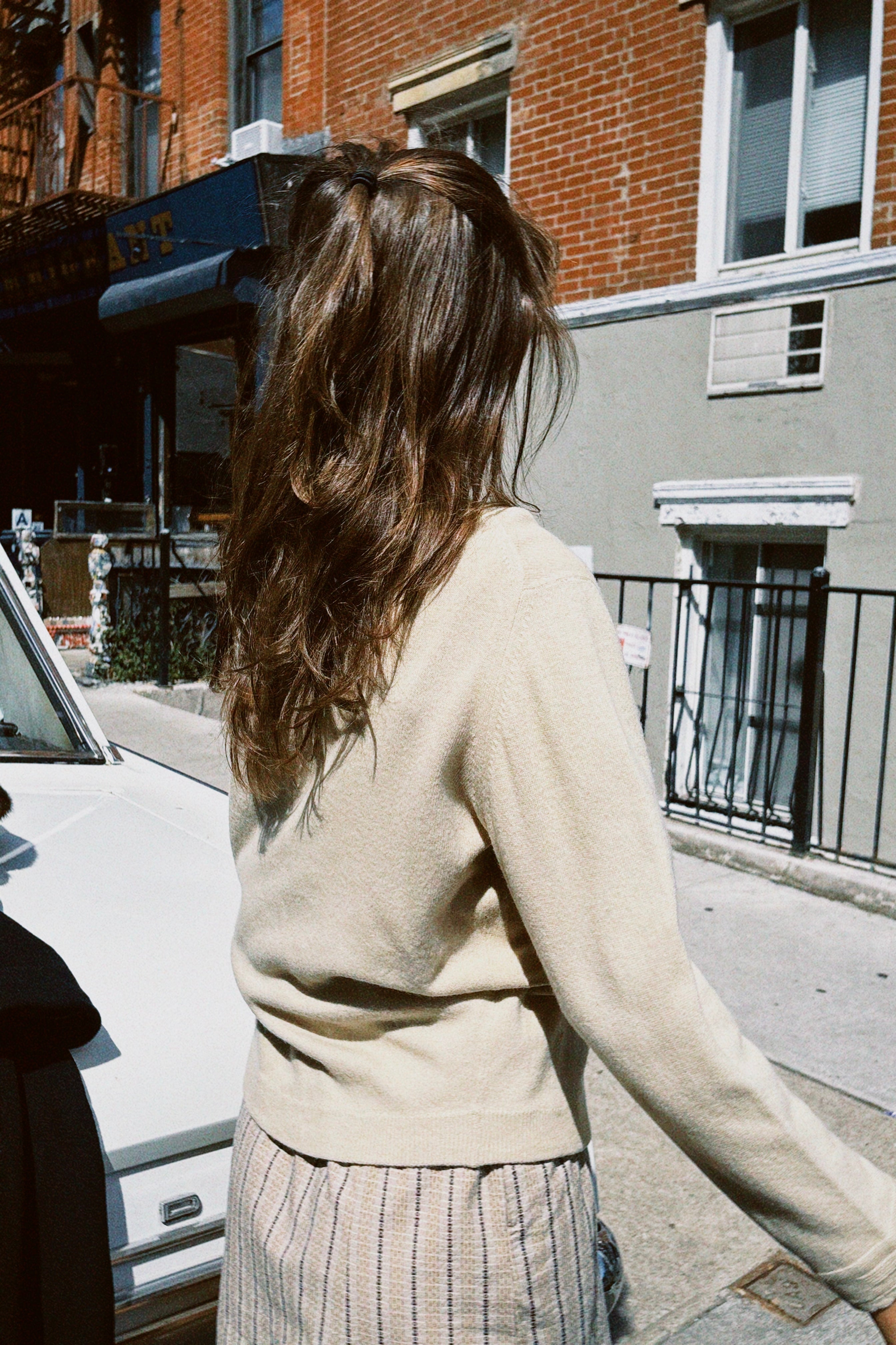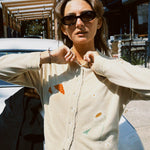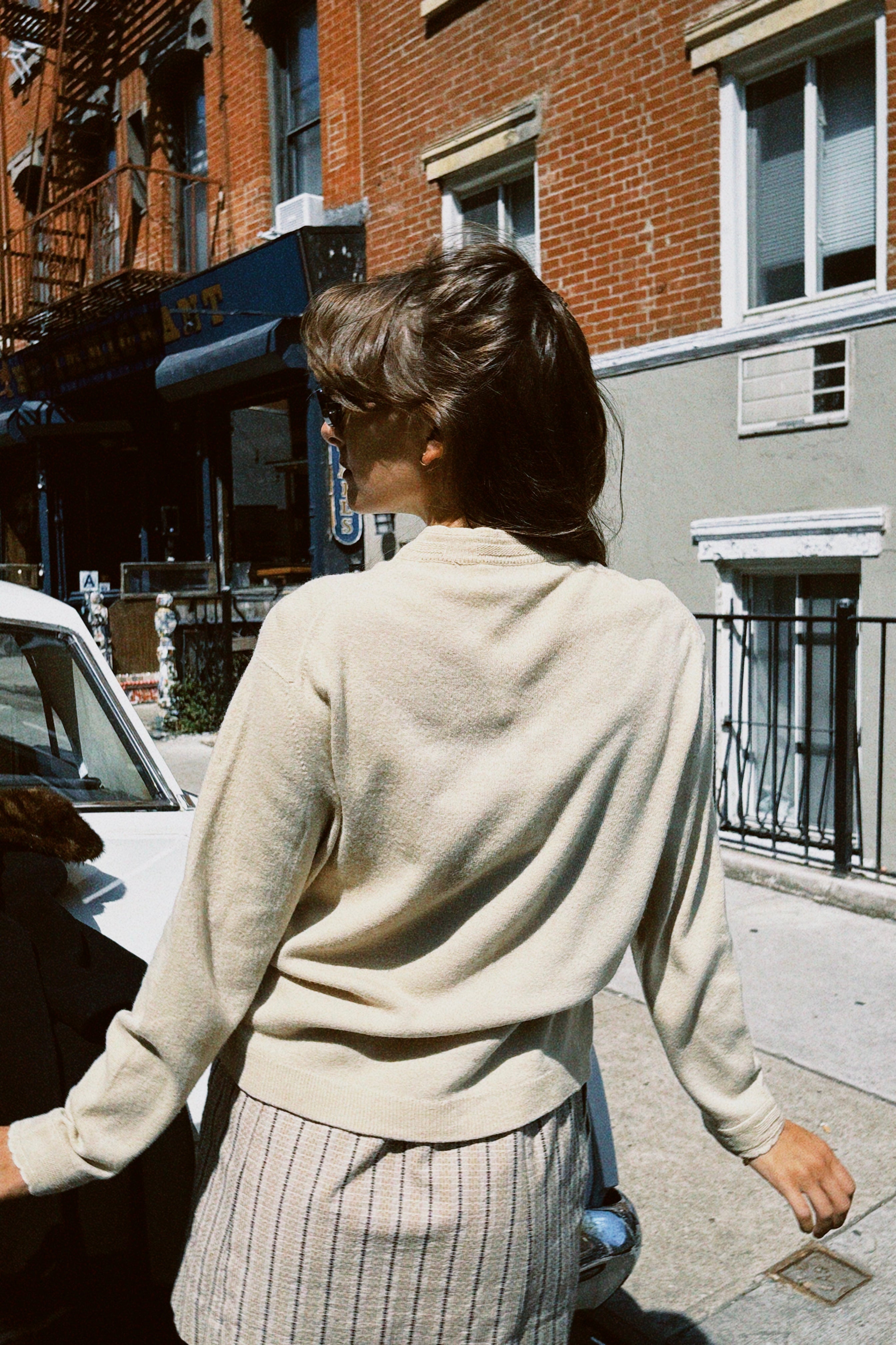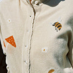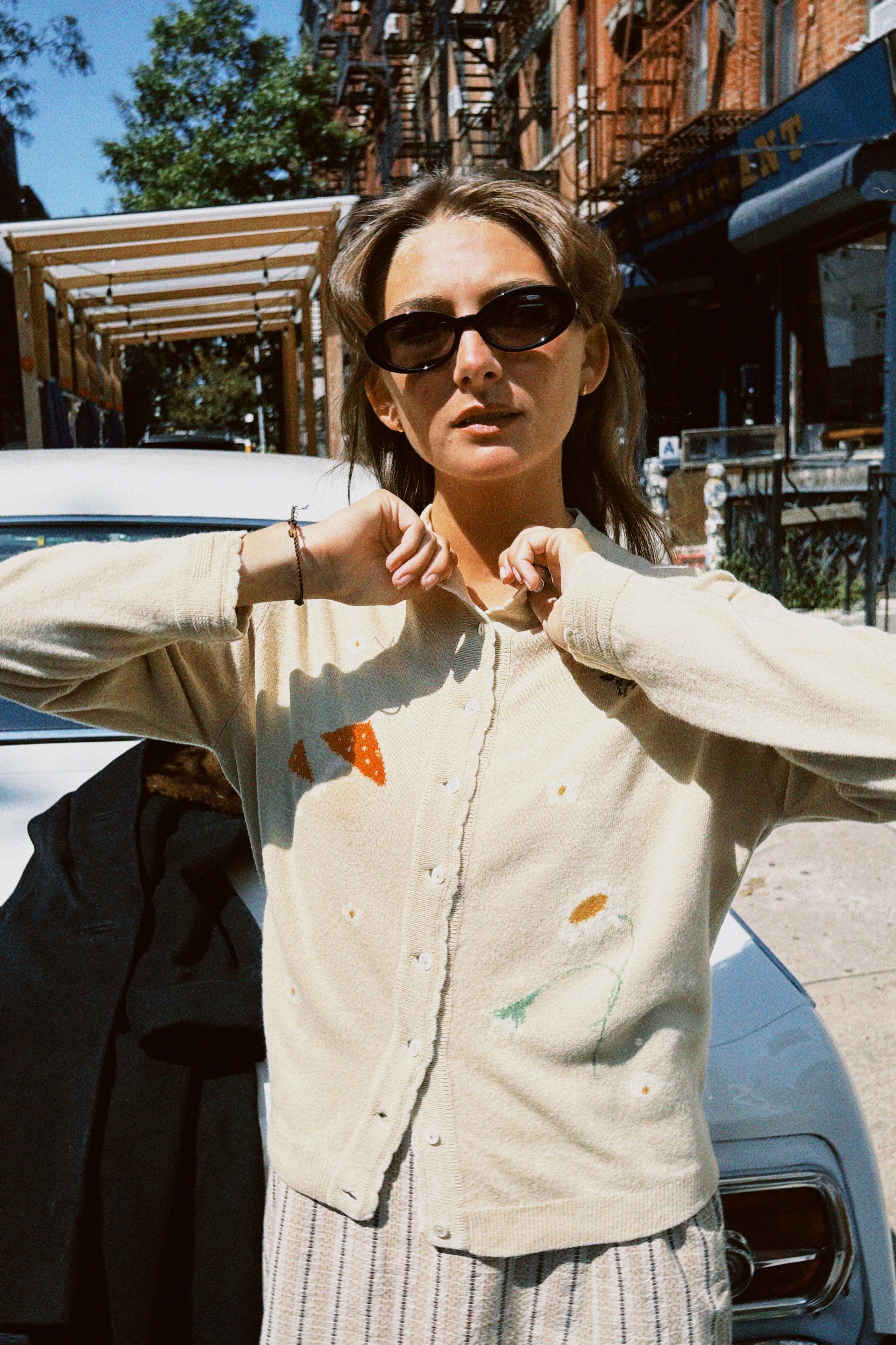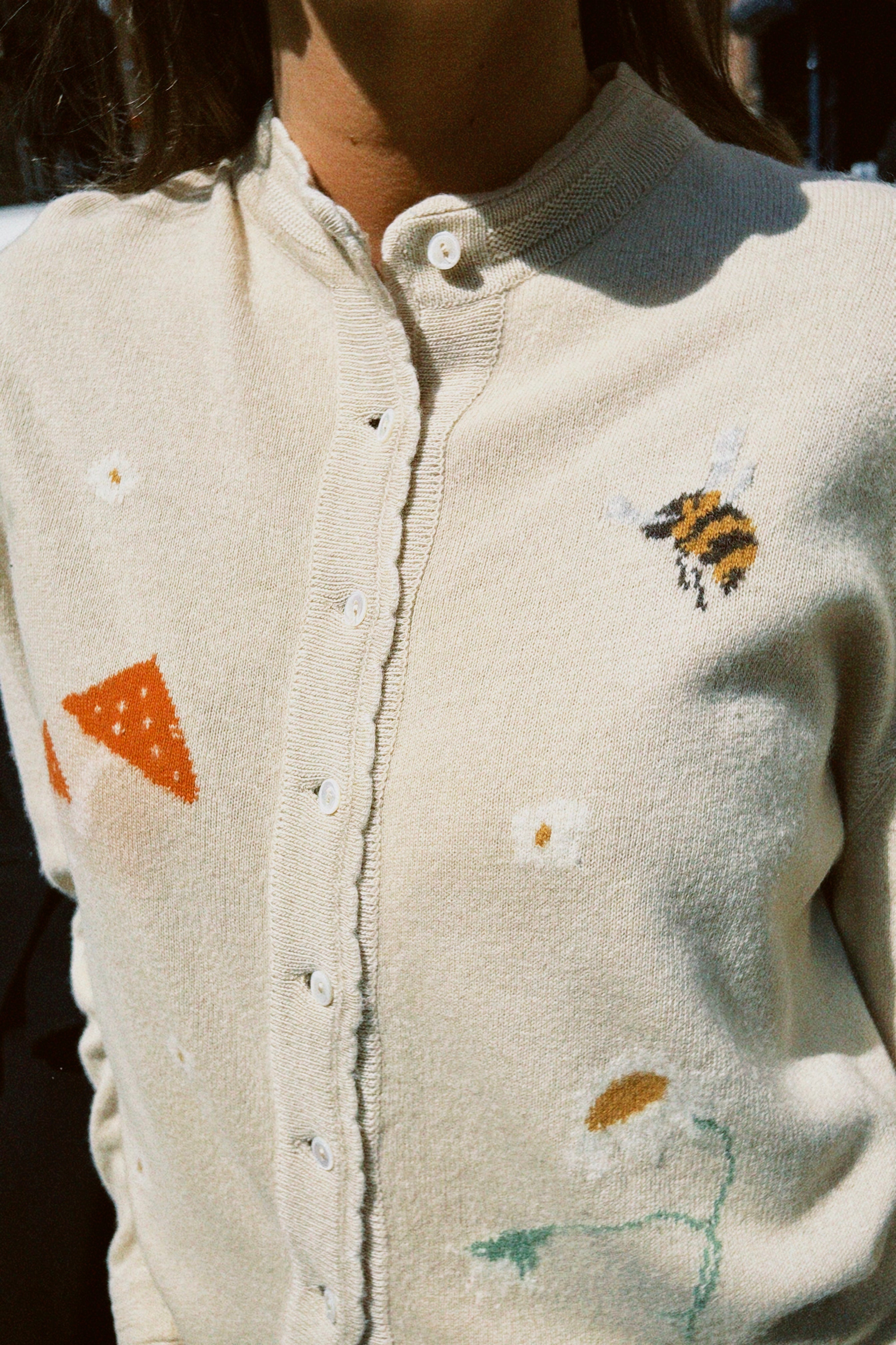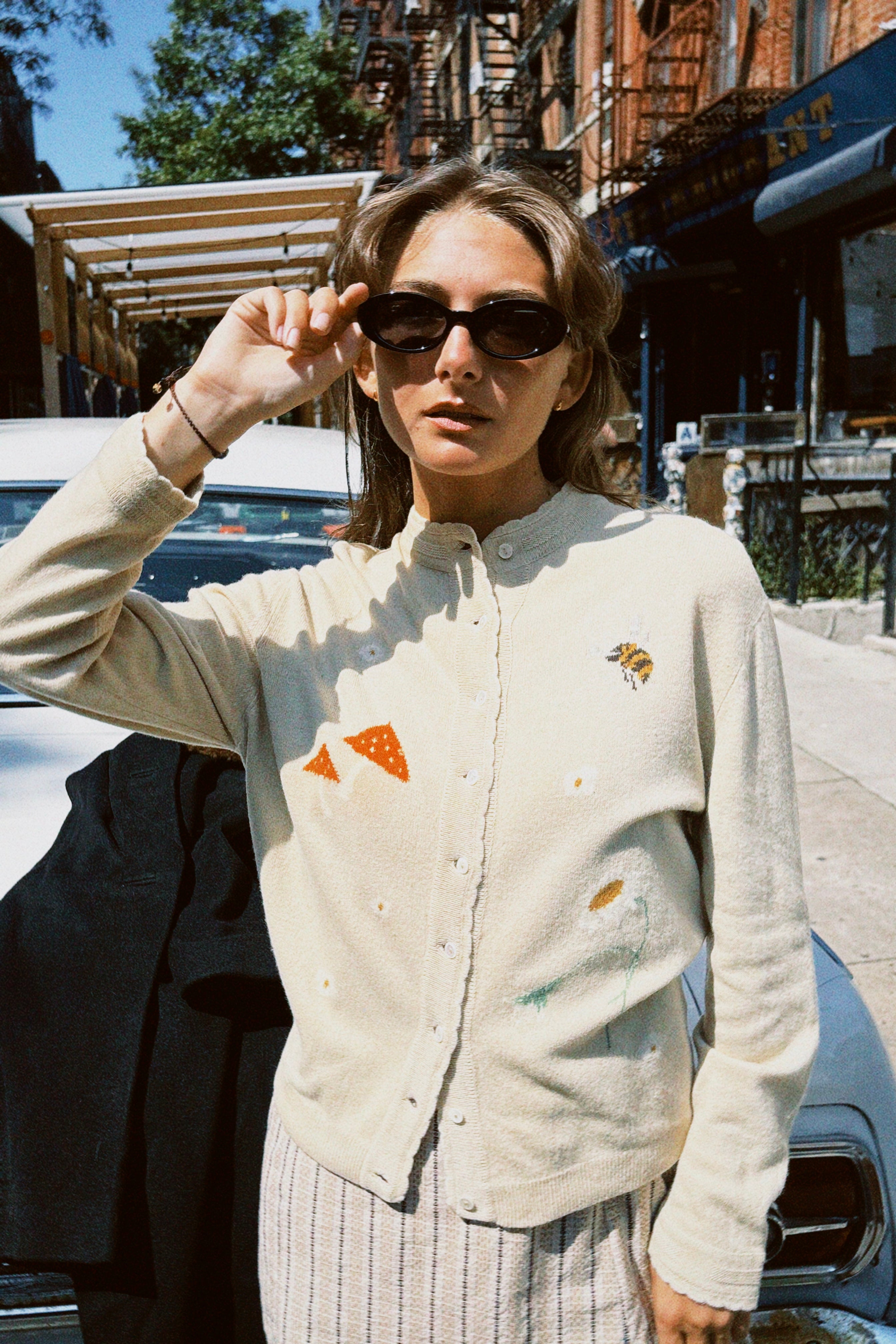 What's not to love about this vintage cutie? Adorable details of daisies, mushrooms, and a bee! Pair this vintage 50's cardigan with your cutest mini dress and Carels. Not only will you look adorable but feel warm by the 100% pure cashmere! In perfect vintage condition.
