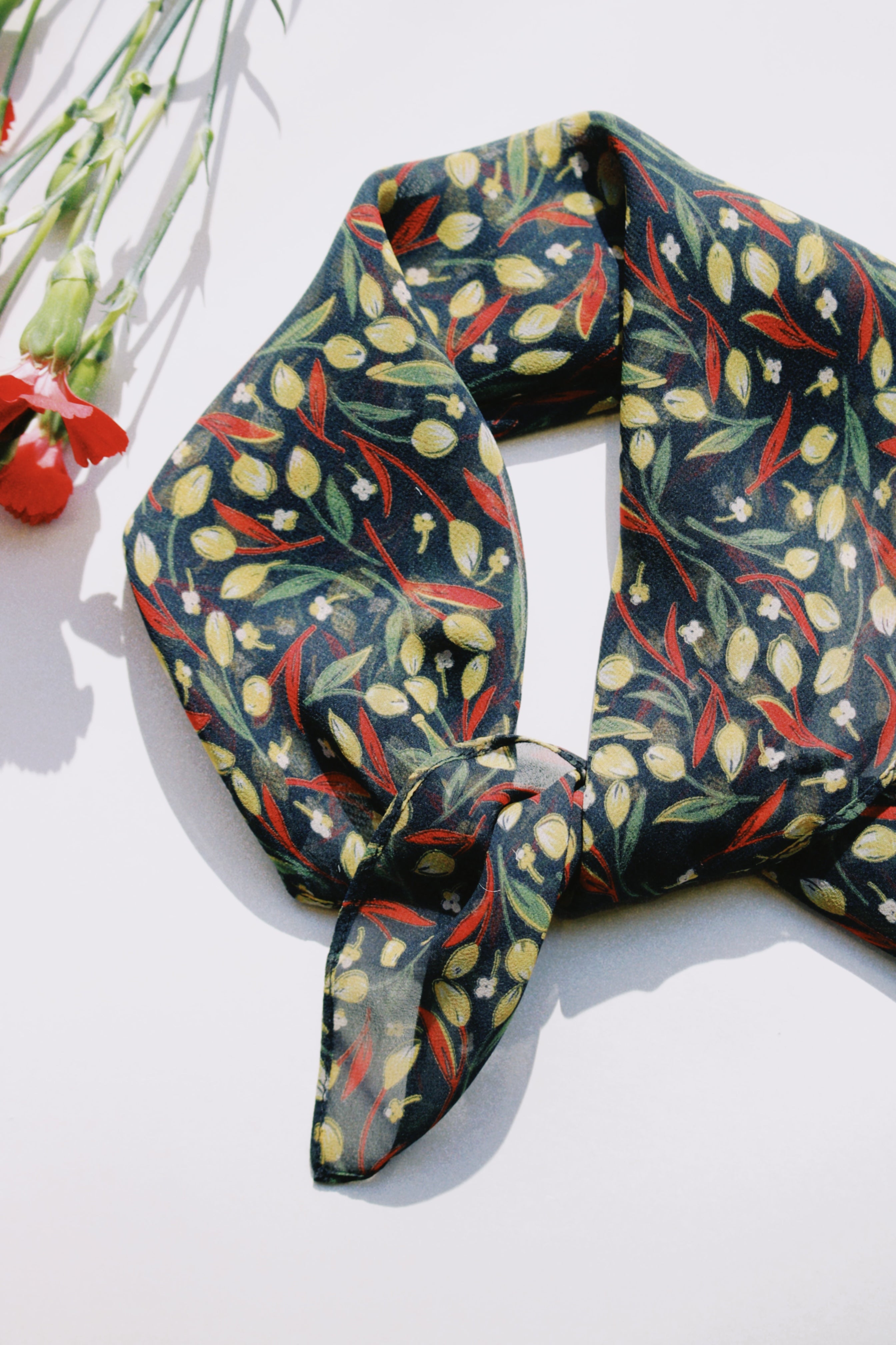 Our new silk scarf is the perfect addition to any outfit. Wear tied under your chin, around your neck or on the handle of your favorite purse.