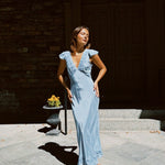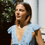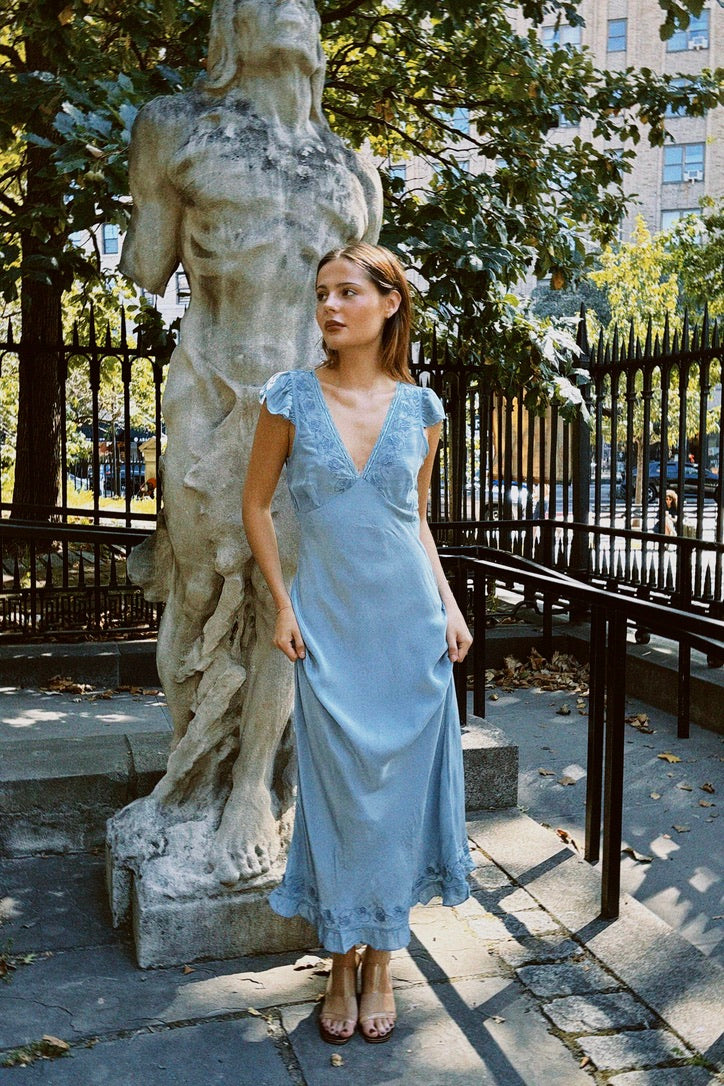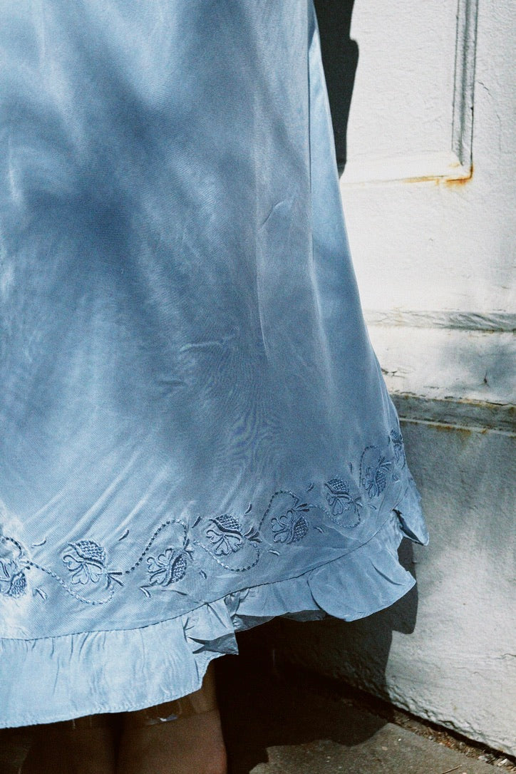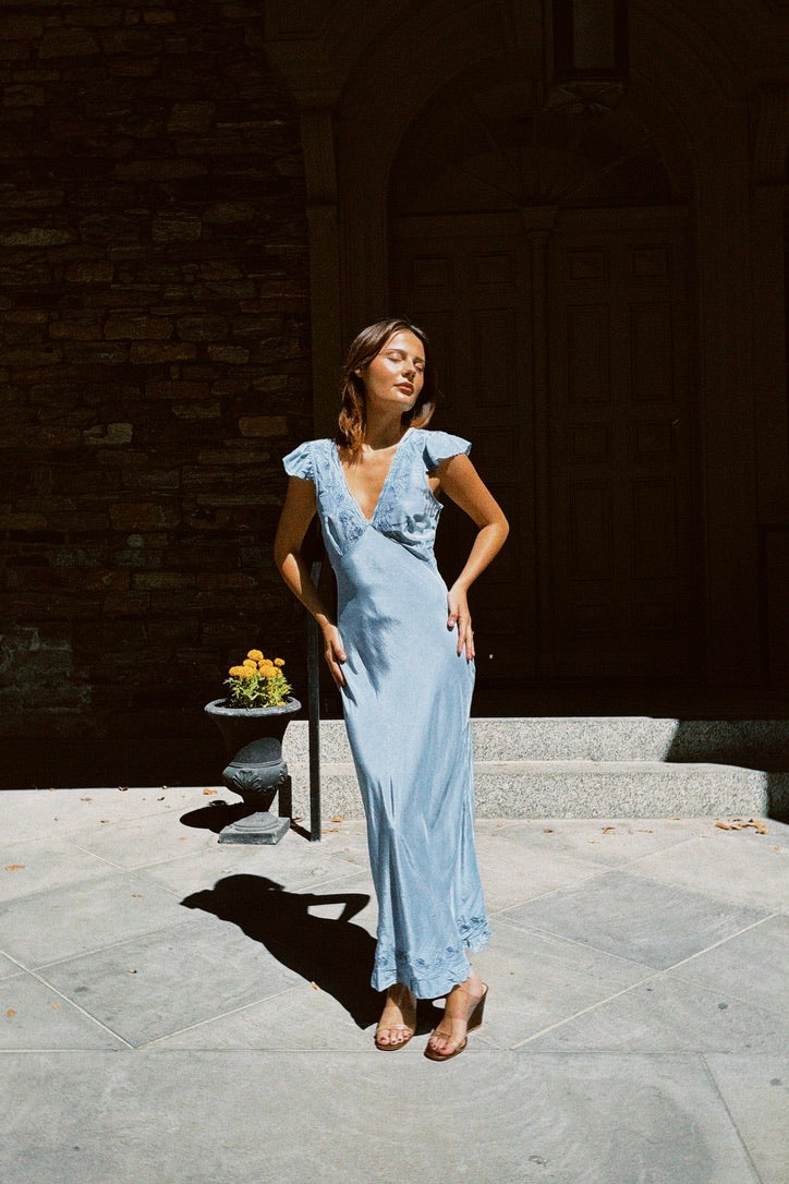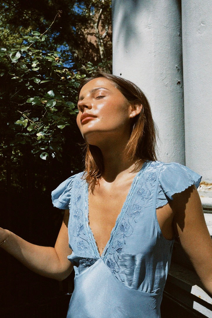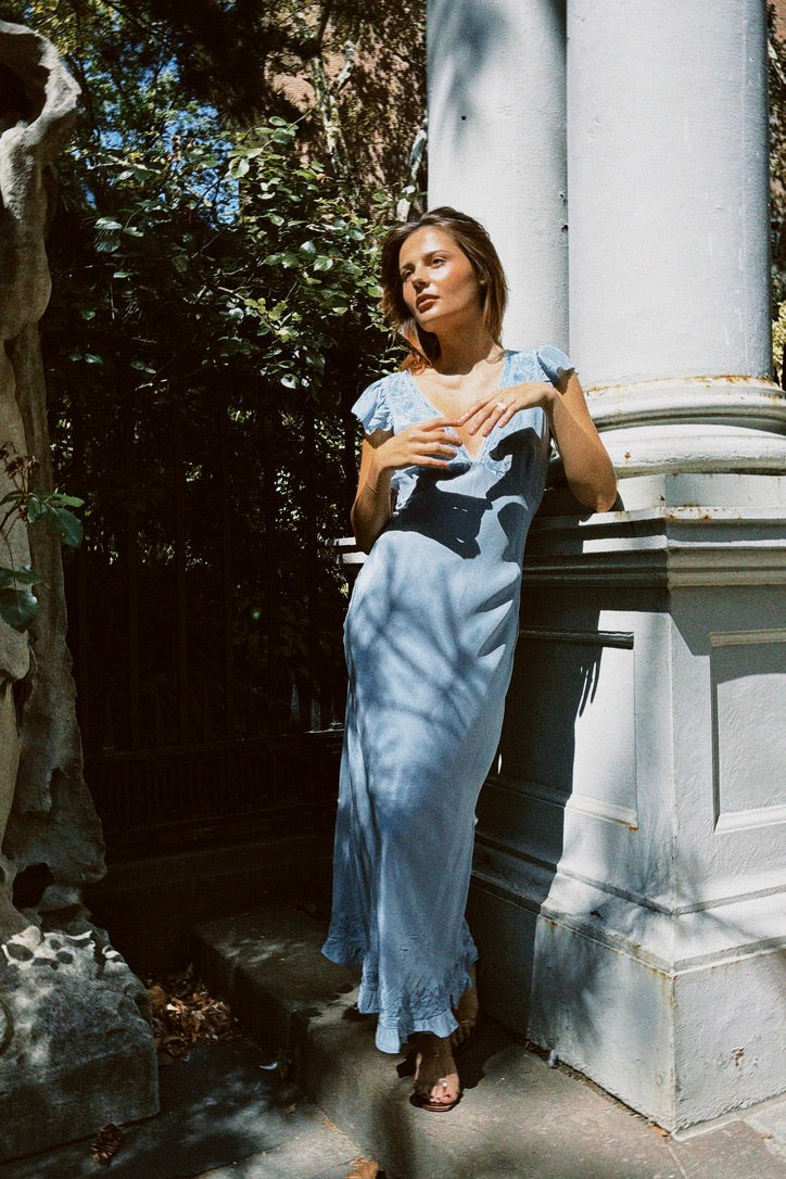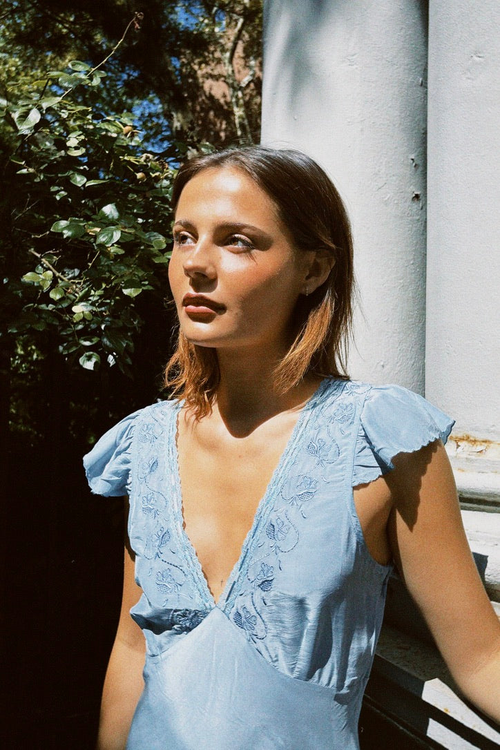 The Isol Dress in Marine is Ciao Lucia's slip of the season featuring flutter sleeves, ruffle detail at the hem with a side zip. This silky slip dress is a midi length with empire seaming at the bust creating a flattering drape on the body. Delicate floral embroidery border the lace and ribbon woven neckline. Every enchanting detail of this slip dress whisks you away to a sunlit coastal escape so we'll be reaching for her over and over.