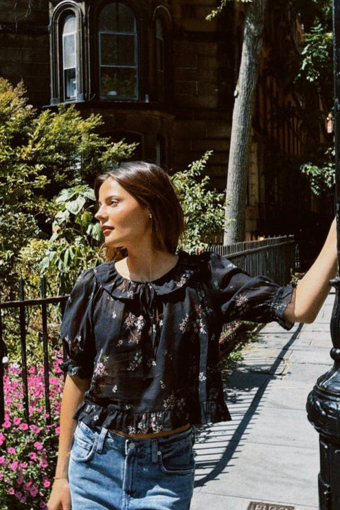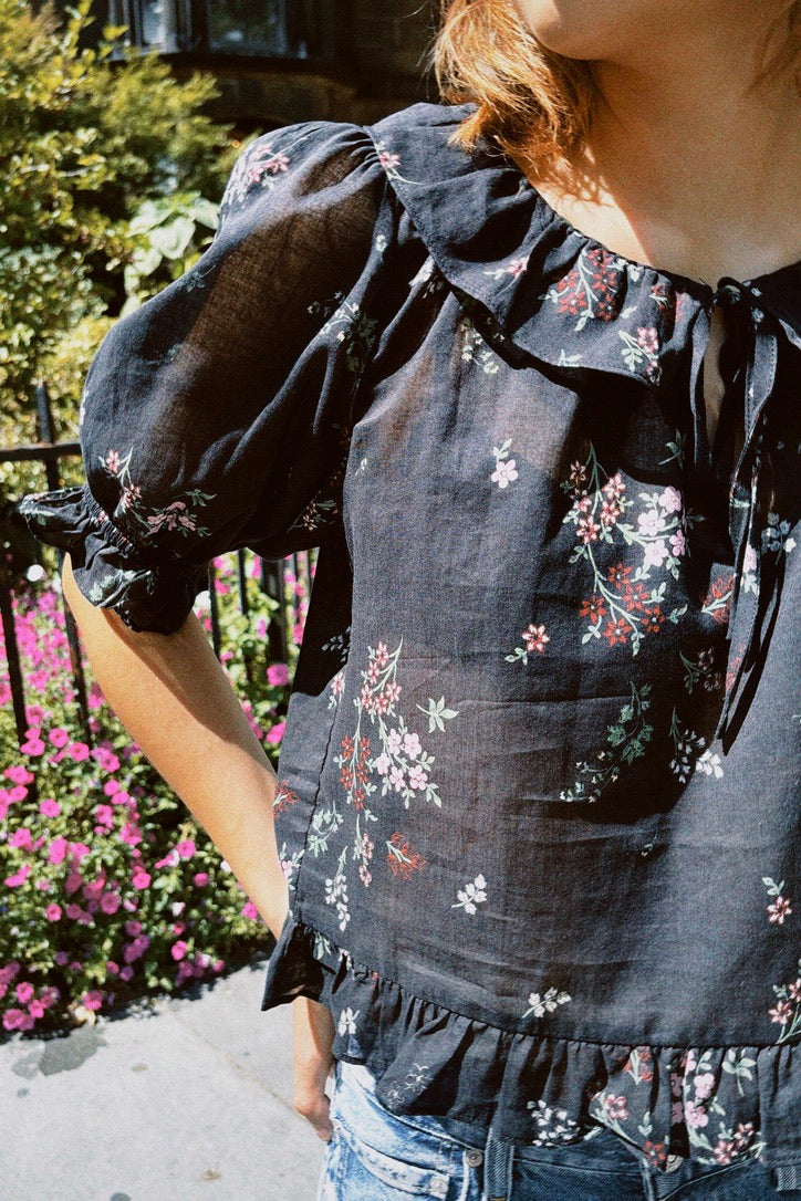 The Thora Top in Wildflower is a three quarter length sleeved blouse with ruffle detail at hem, sleeve and collar. The Thora will surely be a instant staple in your wardrobe as she's crafted from a breathable lightweight cotton voile and features an elegant print making it the perfect top when you're going from desk to drinks.