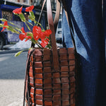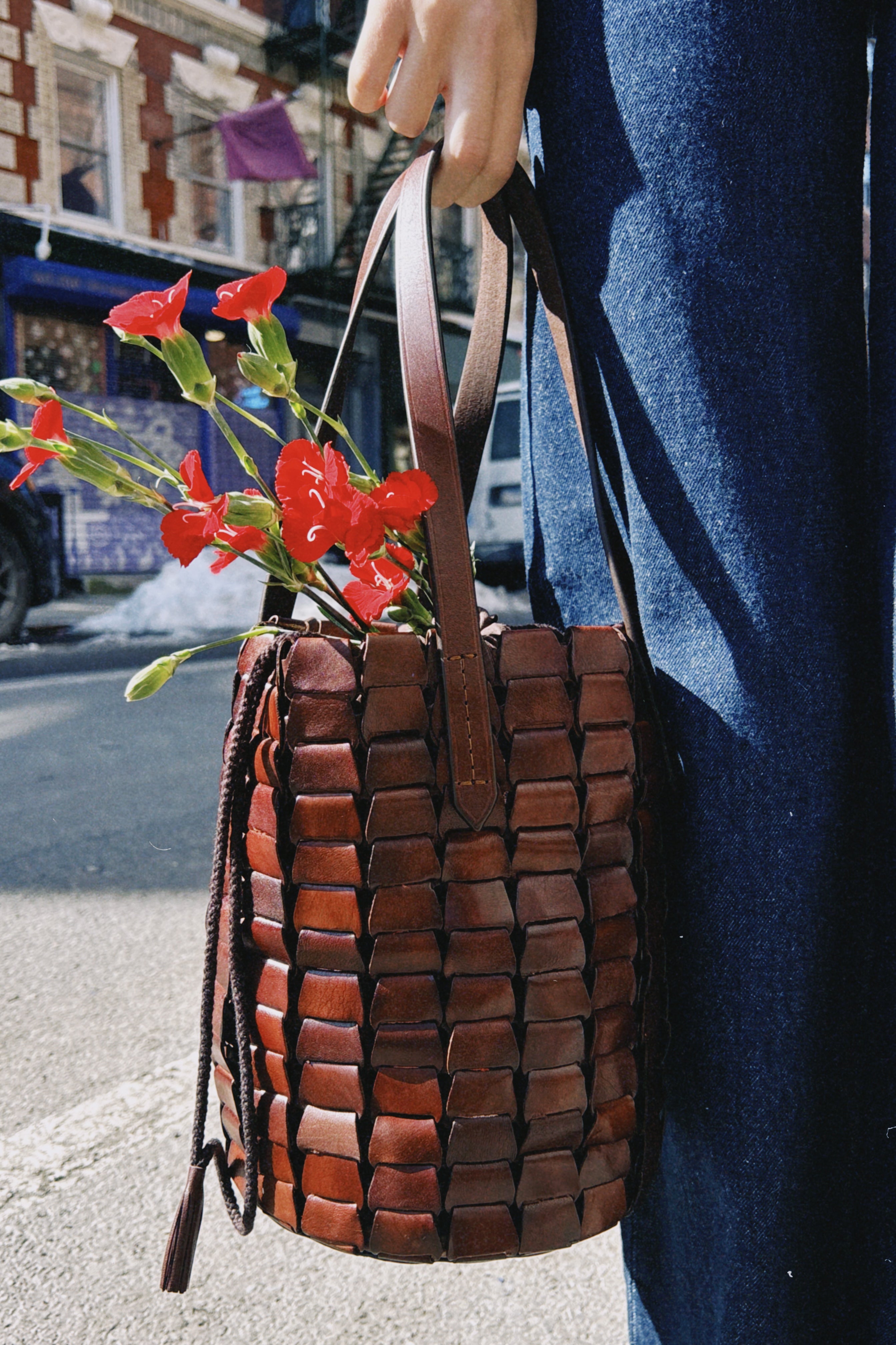 Leather bucket bag with a woven pattern mimicking the look of chain links