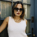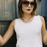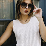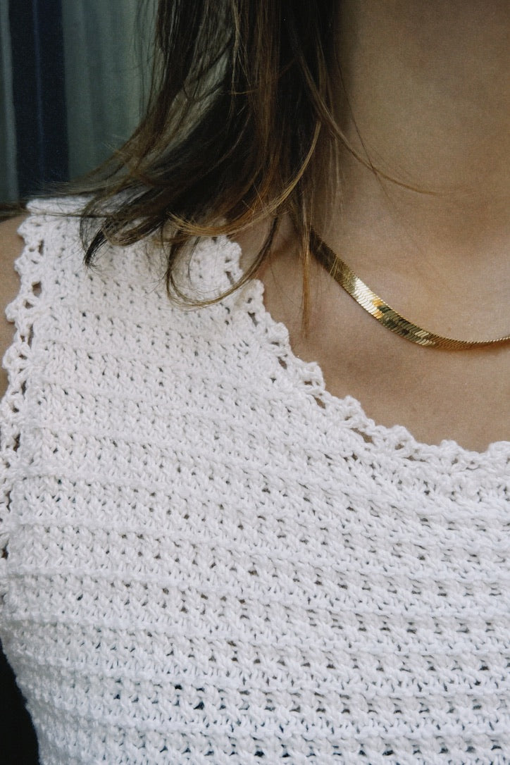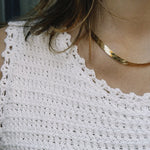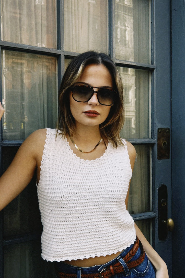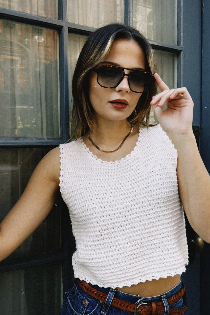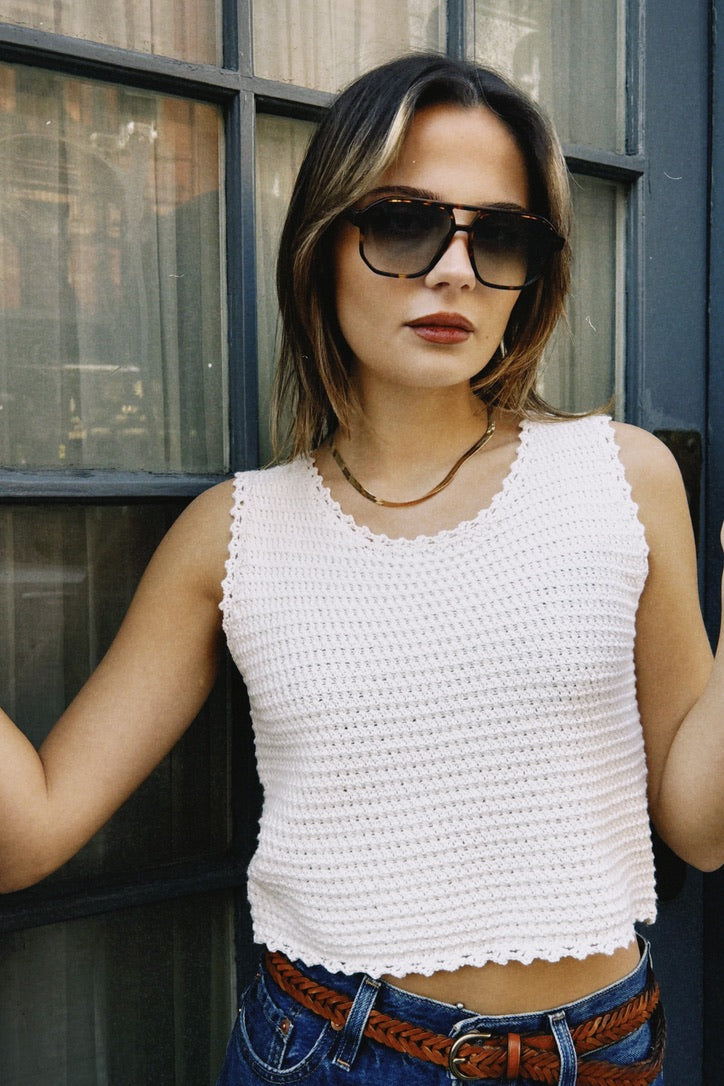 A classic and simple silhouette made with crochet trim for perfect proportions to pair with jeans and shorts. Made from a soft yarn.