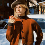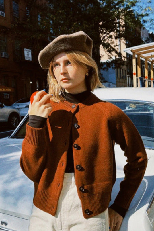 Raglan-sleeve crewneck cardigan with garter-stitch detail along cuffs and bottom hem. Relaxed fit.