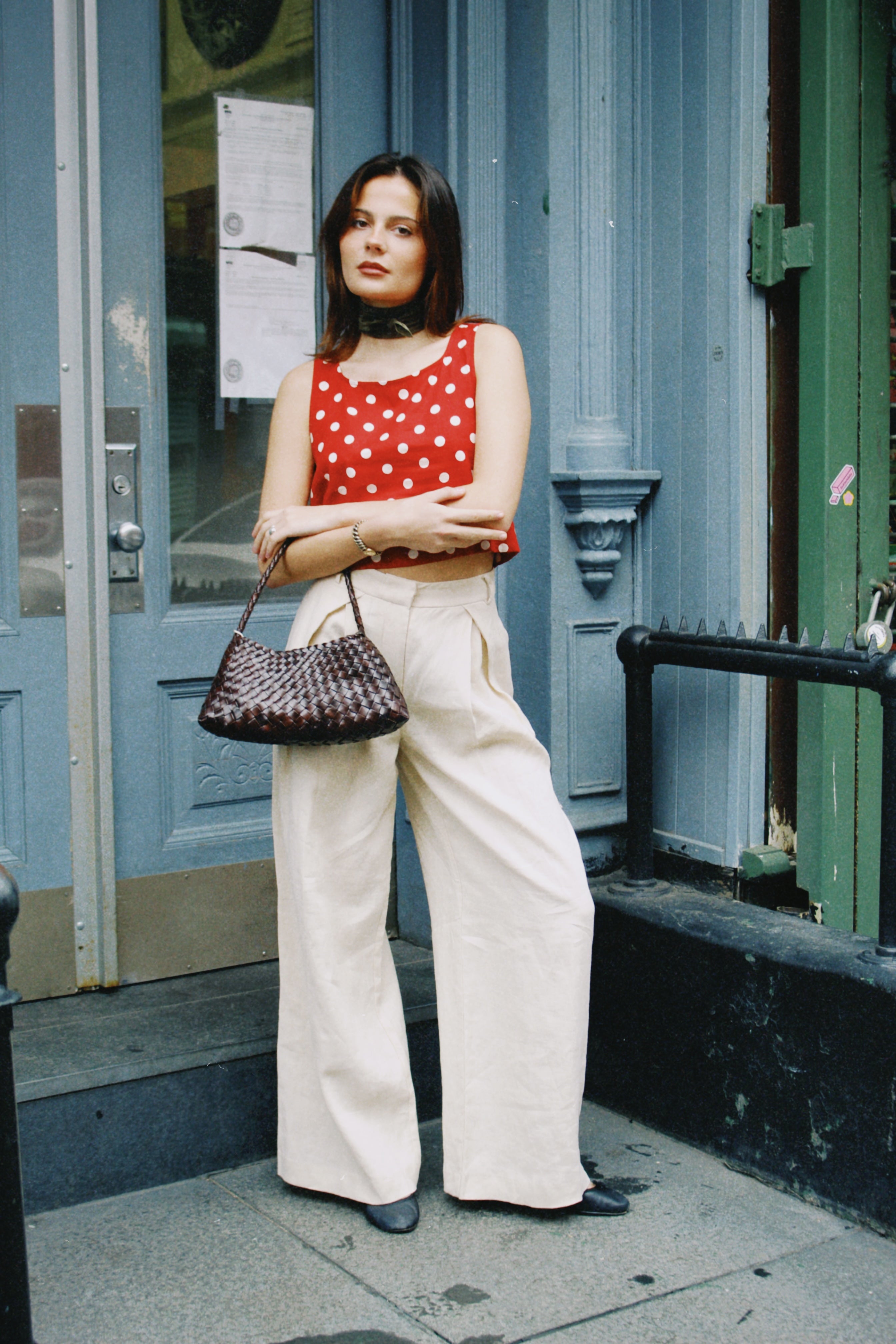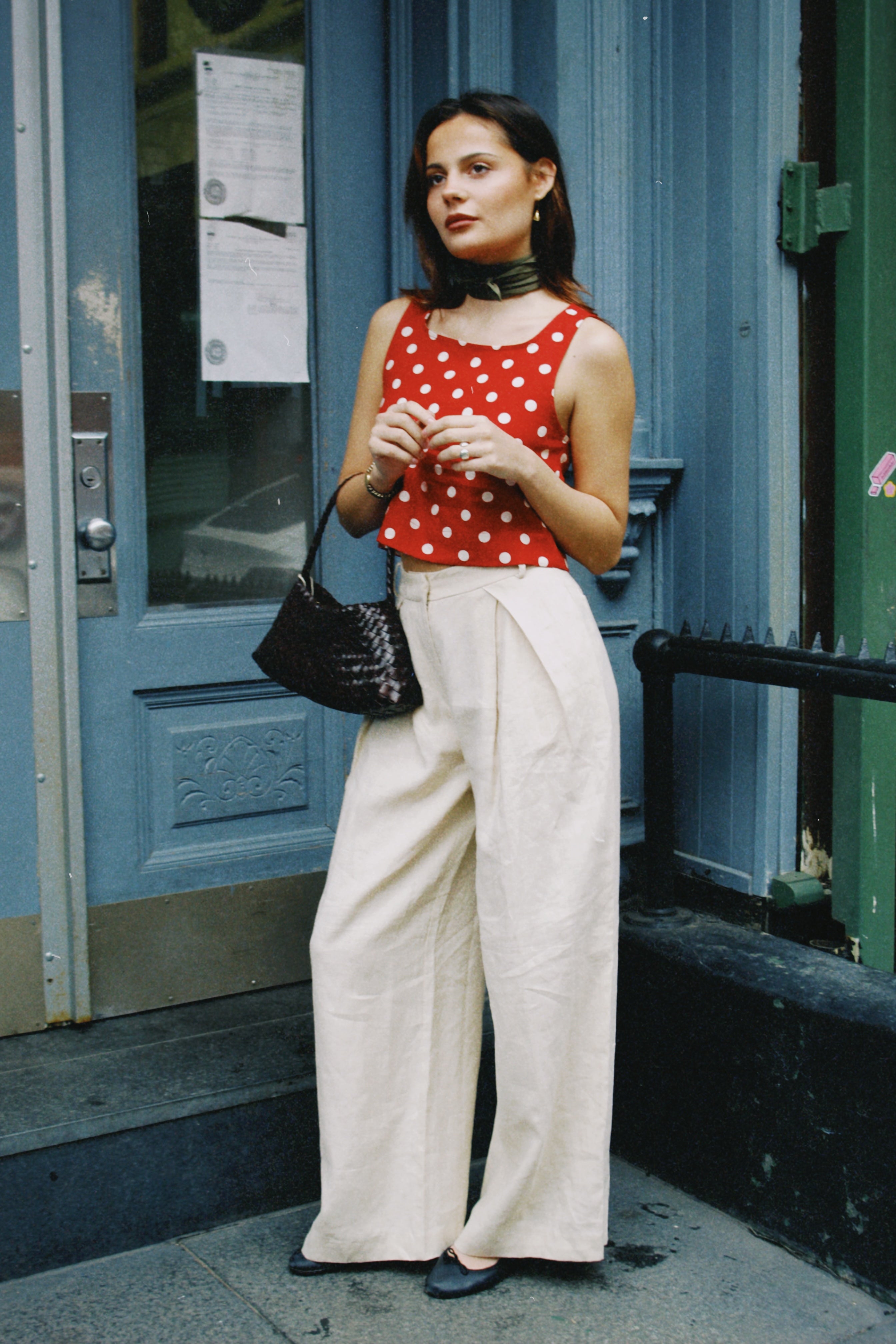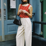 A high-rise trouser, designed from a signature 100% European Flax® linen in a warm neutral. Slightly oversized, they feature a classic front with belt loops, side seam pockets and subtle pleats through the front leg. Their silhouette is wide, flaring out around the ankles. Style under the matching Biba Halter Top for refined yet relaxed vacation dressing.