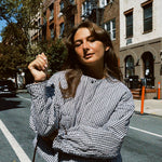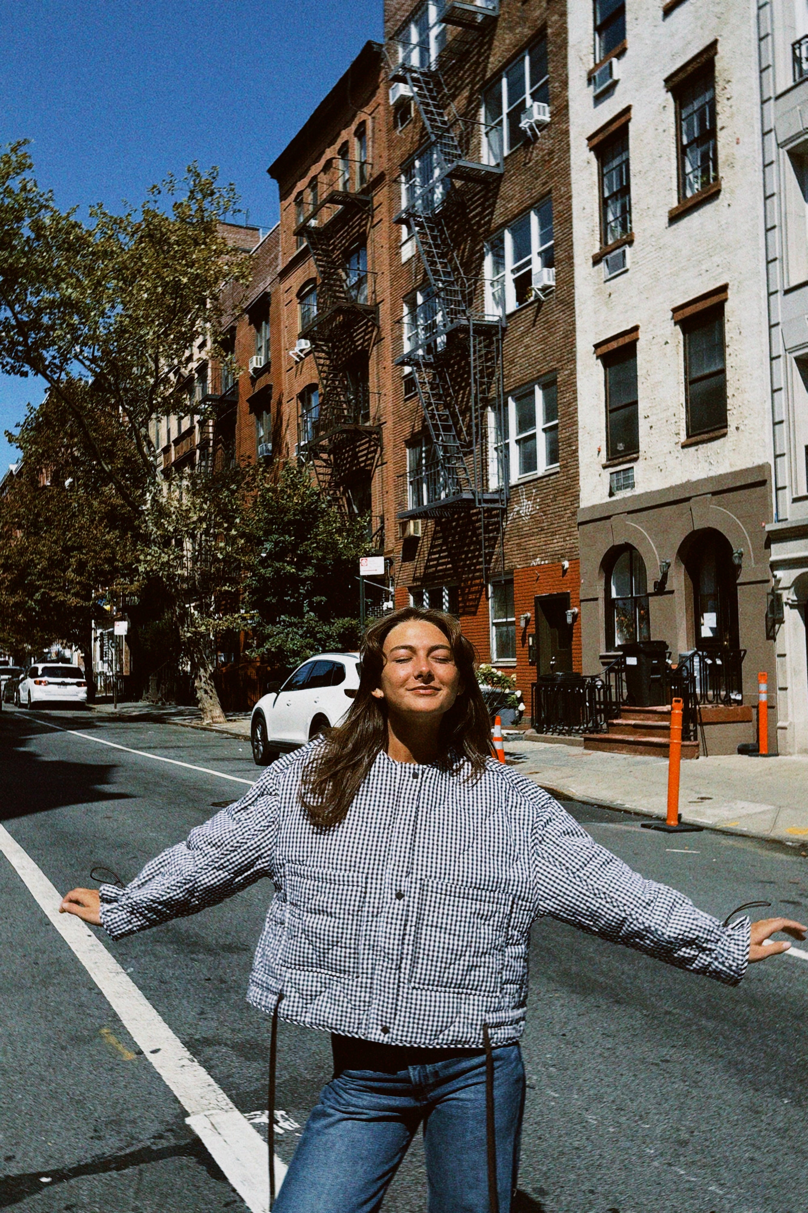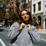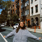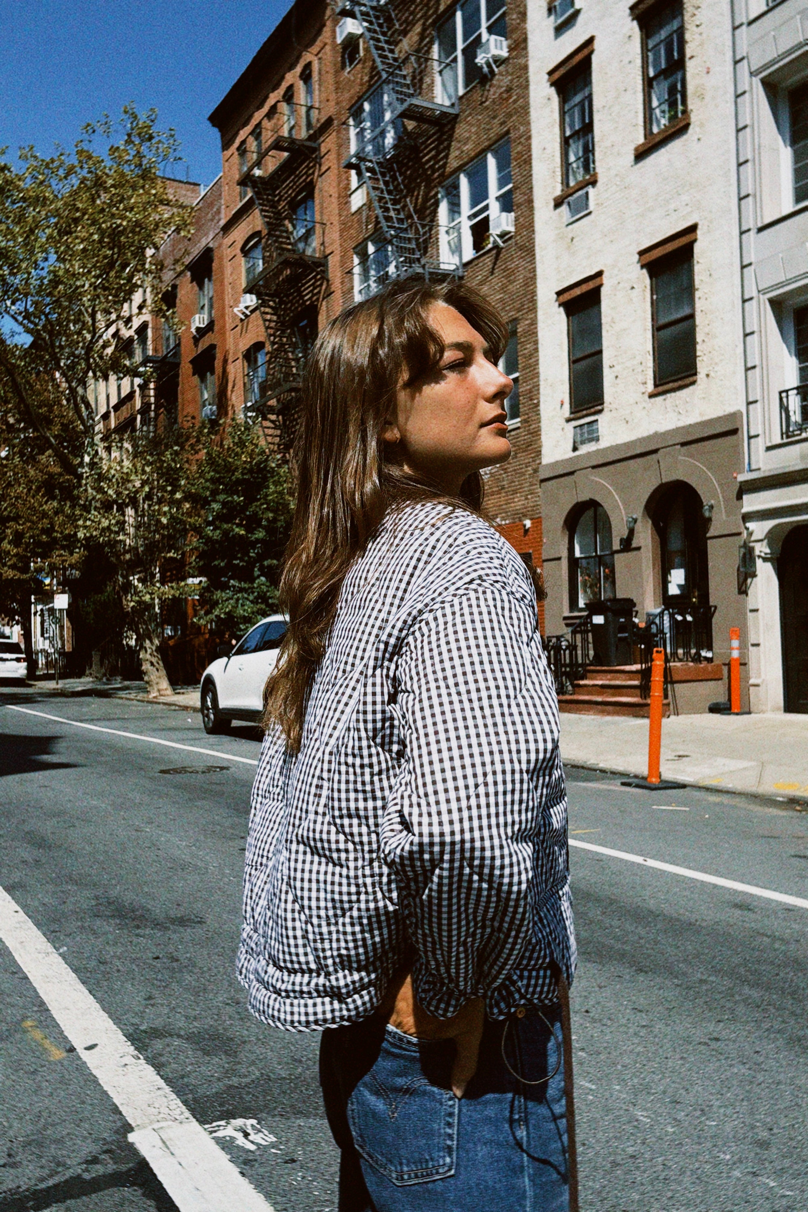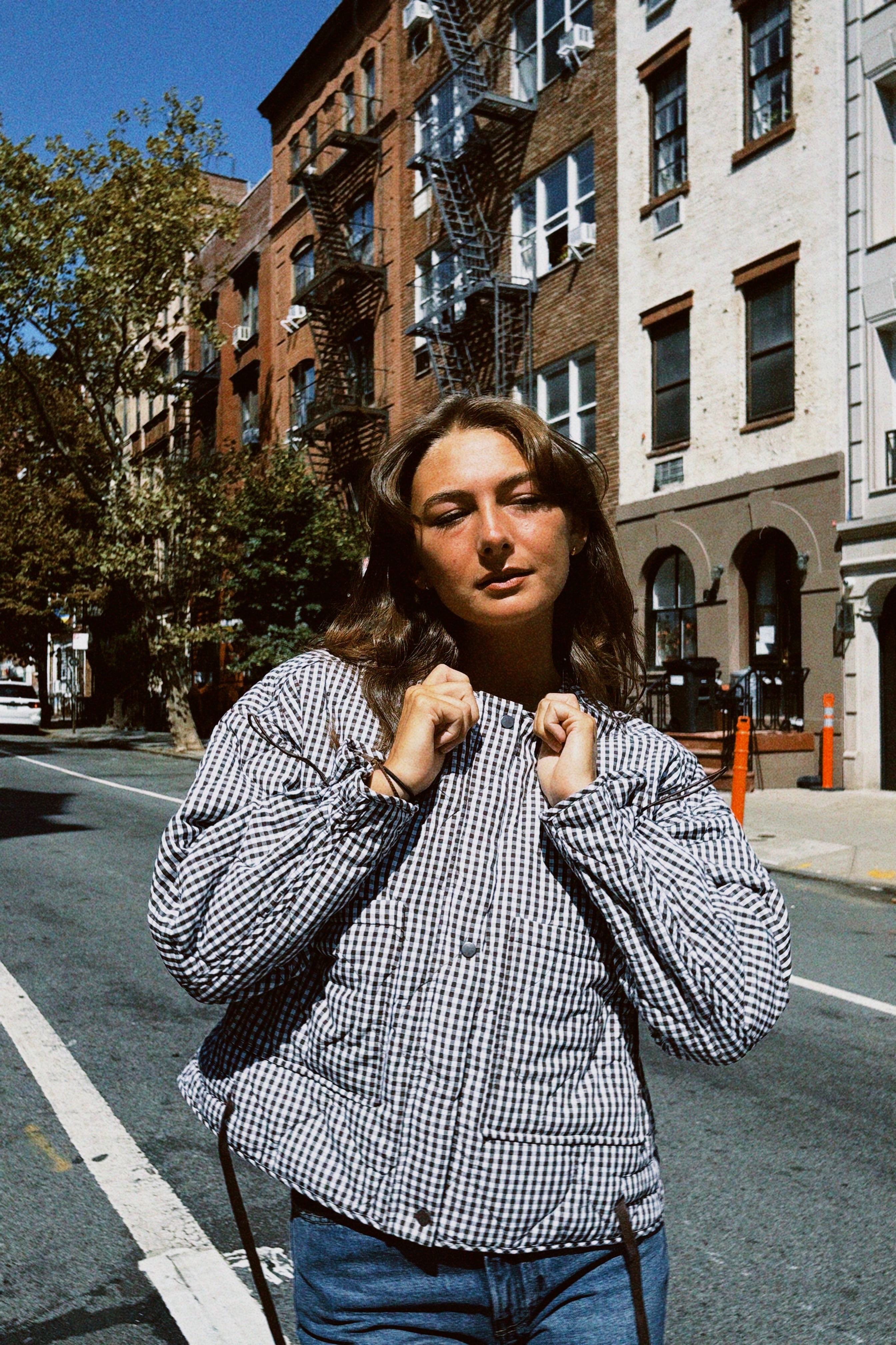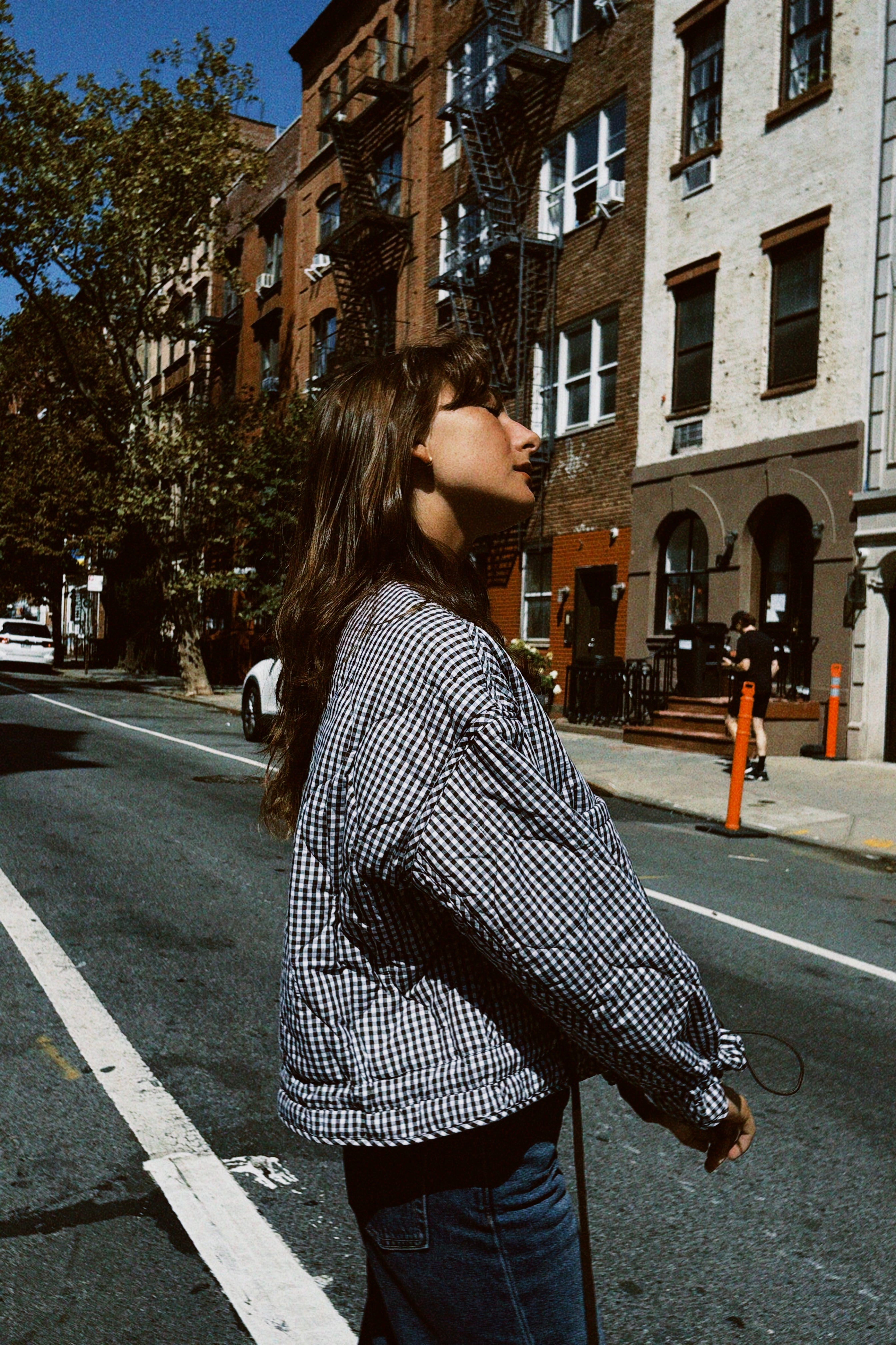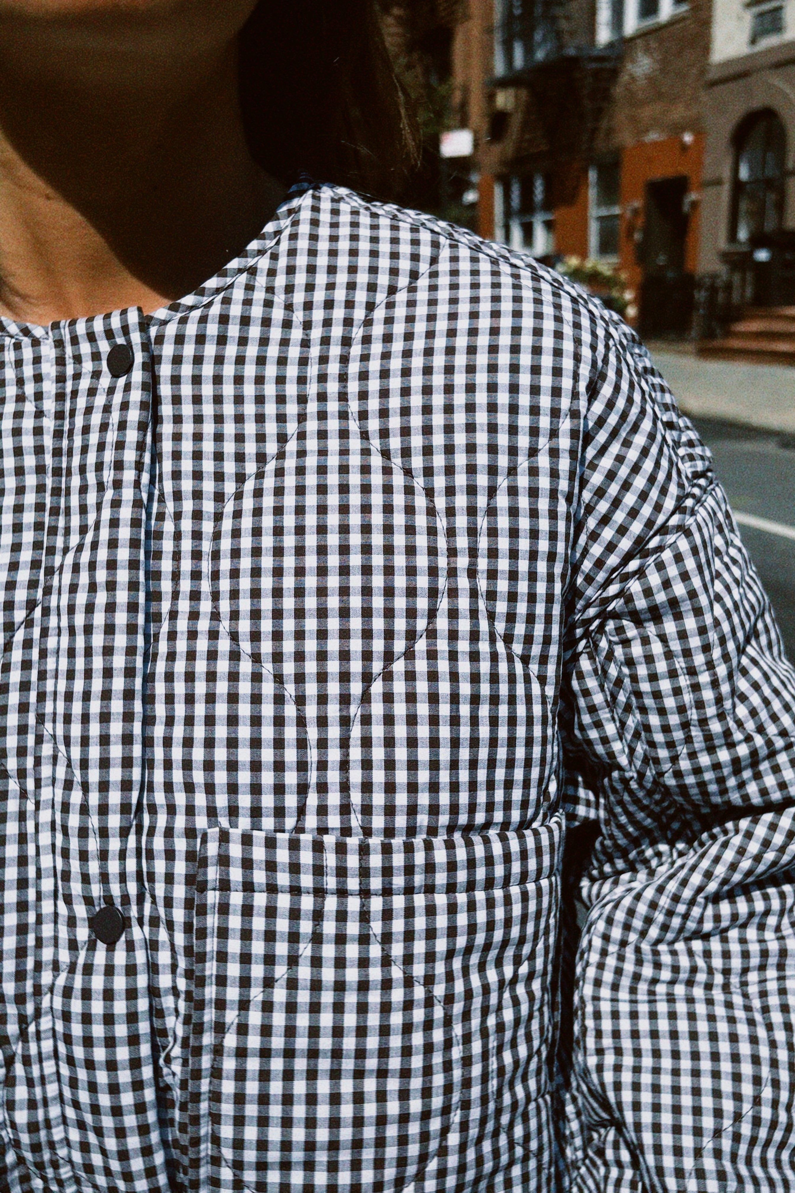 Jess is wearing size S. This jacket runs true to size with a slightly boxy fit.