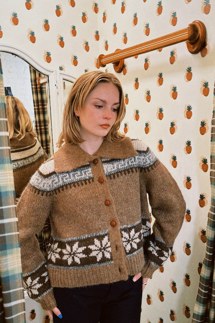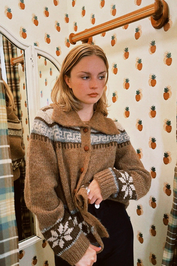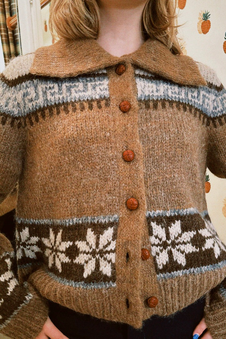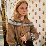 Knit from a soft alpaca blend yarn, The Nordic Scholar Cardigan features a classic Fair Isle motif with a mix of Greek key and floral patterns. Designed with an oversized collar, raglan sleeves, and ribbed cuffs and hem, it’s finished with a row of real leather buttons down the front. The fit is relaxed with thoughtful proportions and a subtle nod to traditional knitwear.