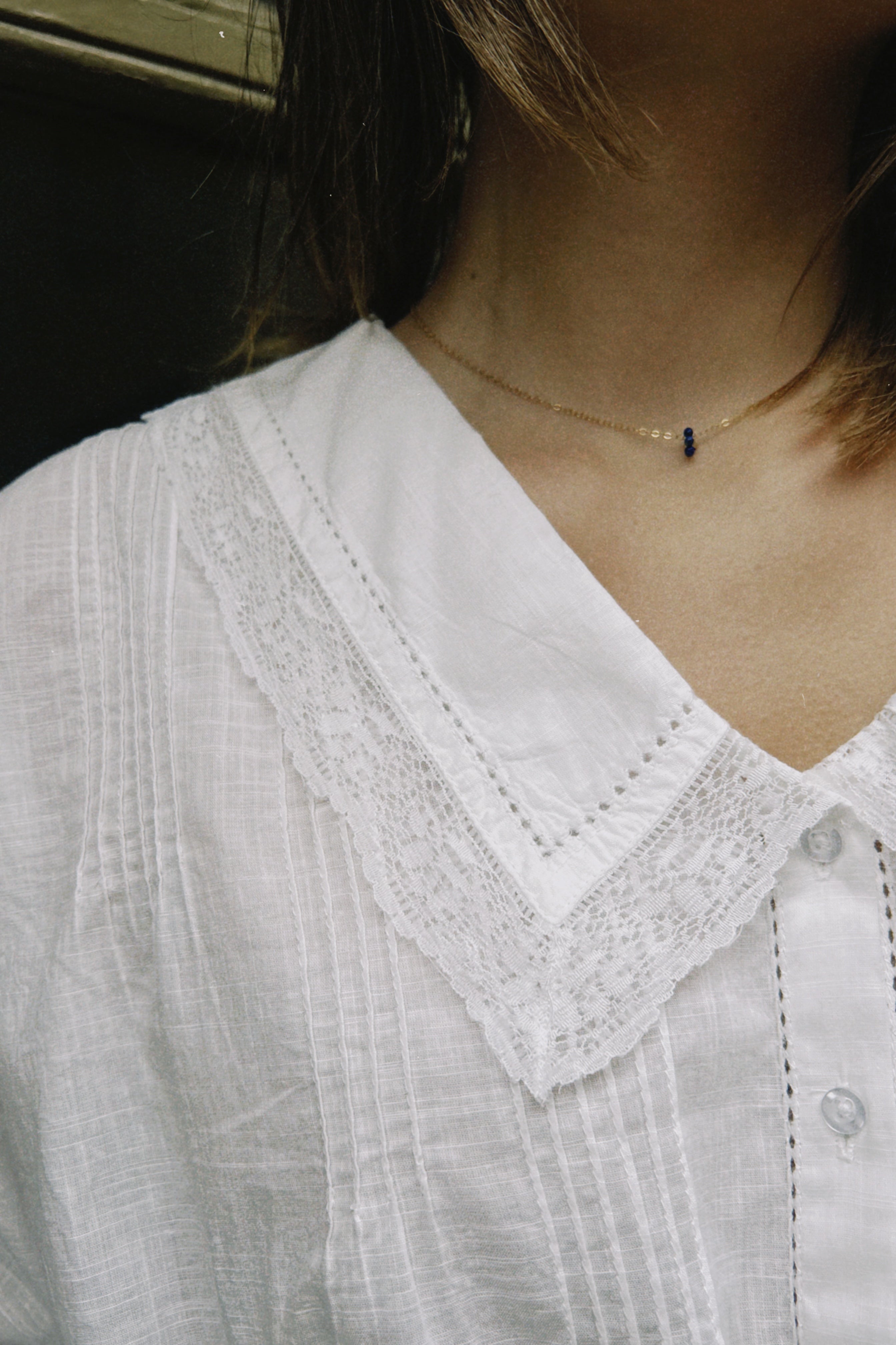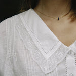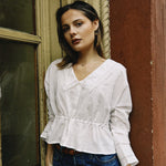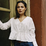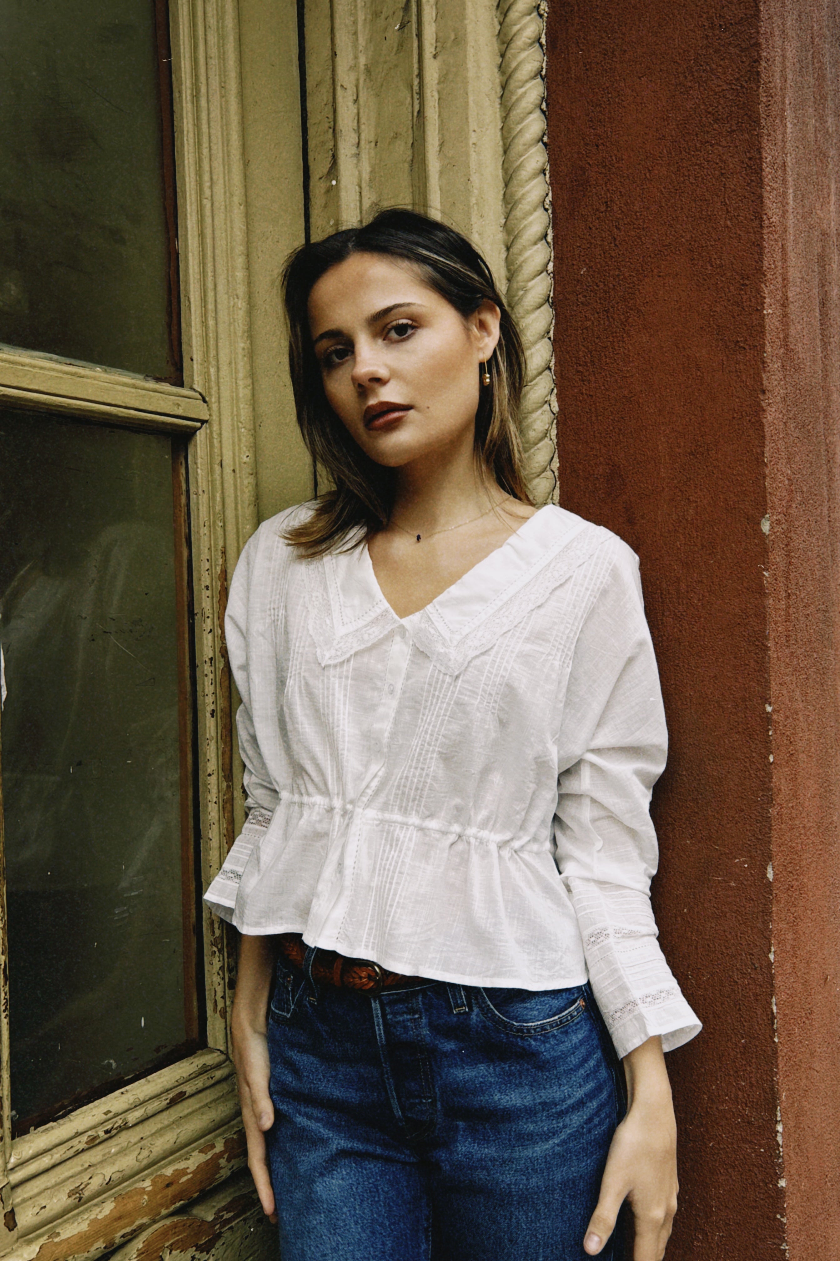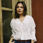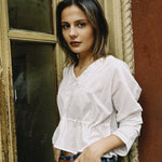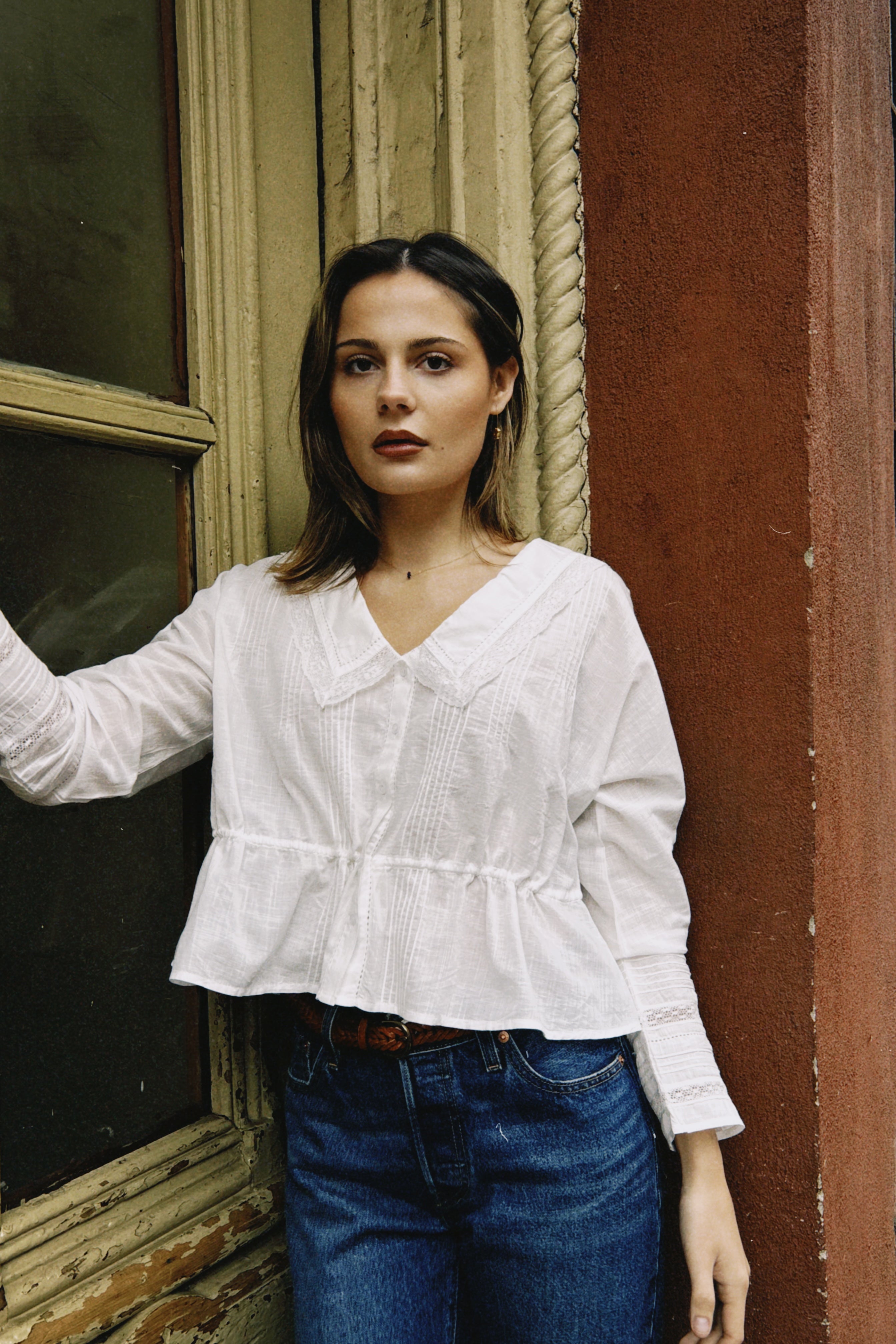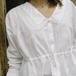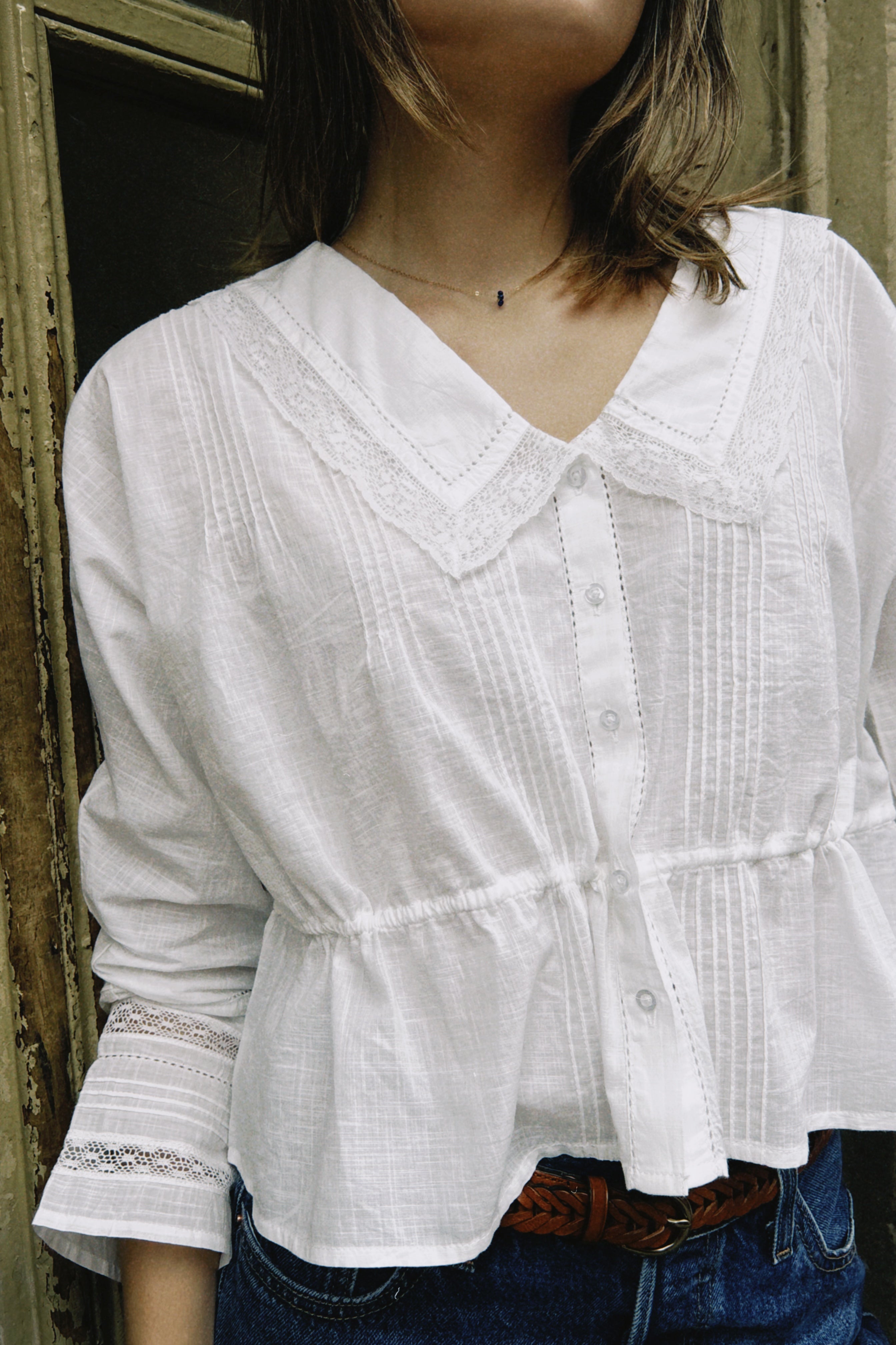 Inspired by vintage Victorian tops we’ve collected over the years, The Harper Top. captures the romance of the era with delicate lace and pintuck detailing set against a floaty cotton fabric. A 1940s-inspired collar with an open V-shape adds subtle structure, while dolman sleeves taper gently to the wrist for a soft finish. The fit is loose and easy through the body, complete with an interior waist channel and delicate cotton tie that allows you to cinch the silhouette as desired. A slightly cropped length makes it perfect for pairing with high-waisted trousers or vintage denim.
