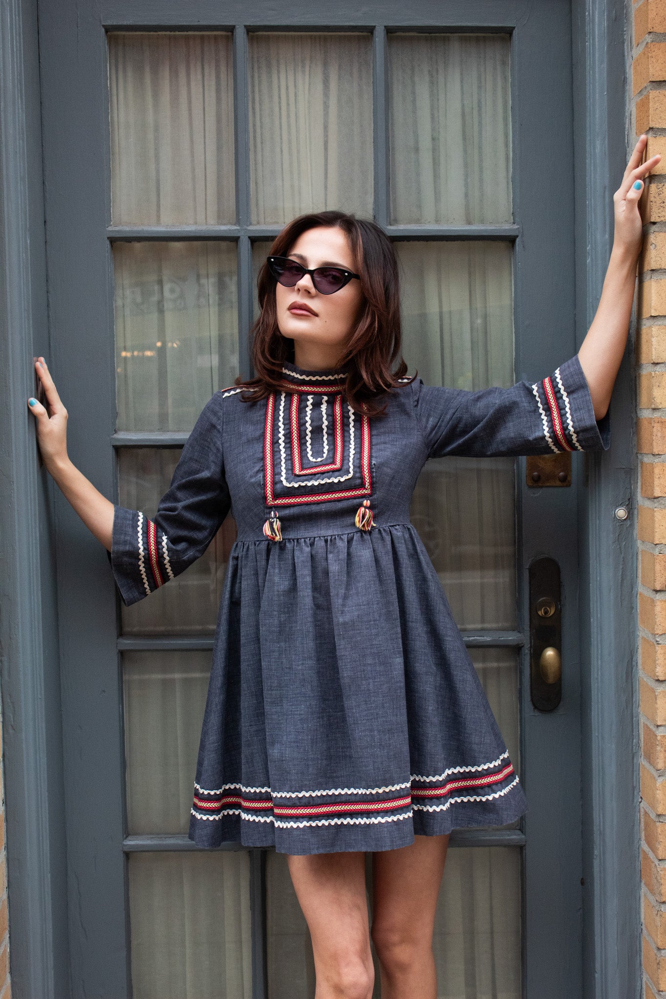 Step into timeless charm with this adorable vintage babydoll mini dress, featuring delicate rick rack trim that adds a touch of nostalgic sweetness. This piece captures the playful spirit of vintage fashion with its flattering silhouette and feminine details.