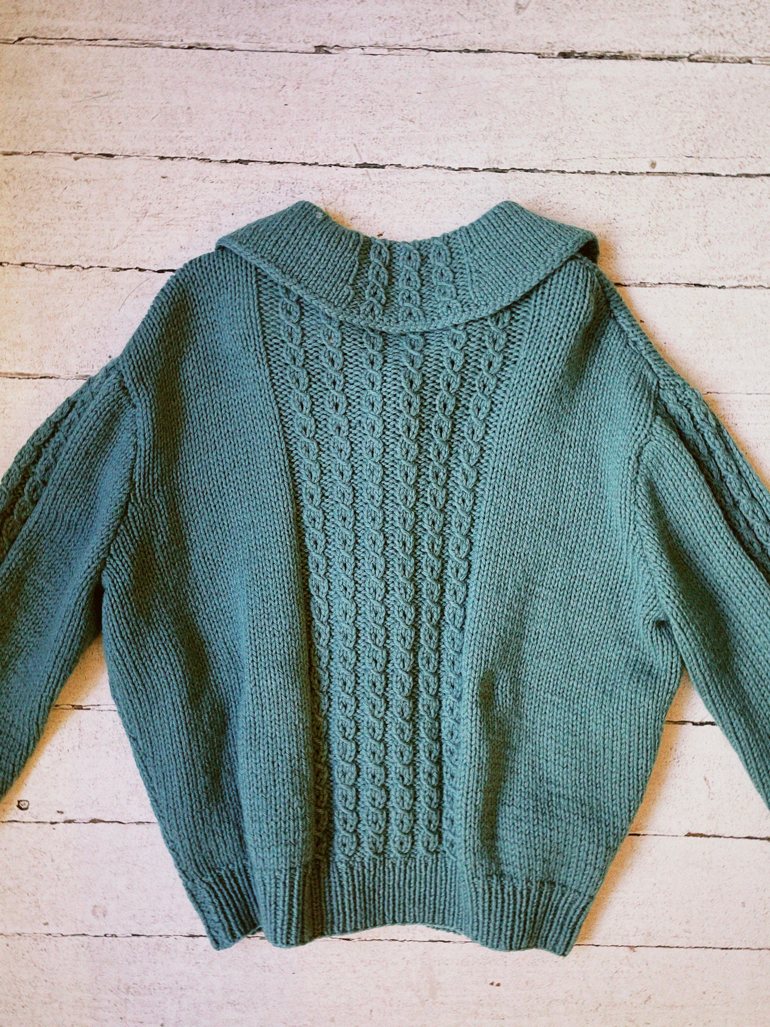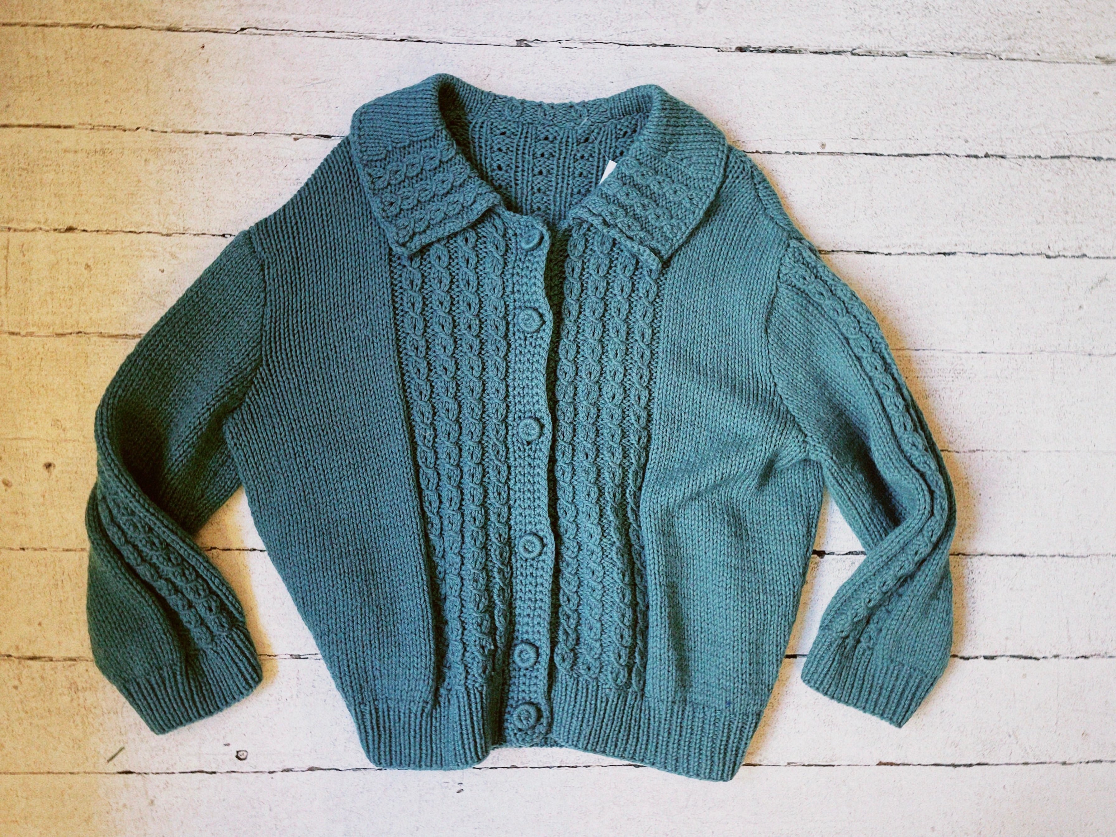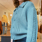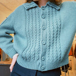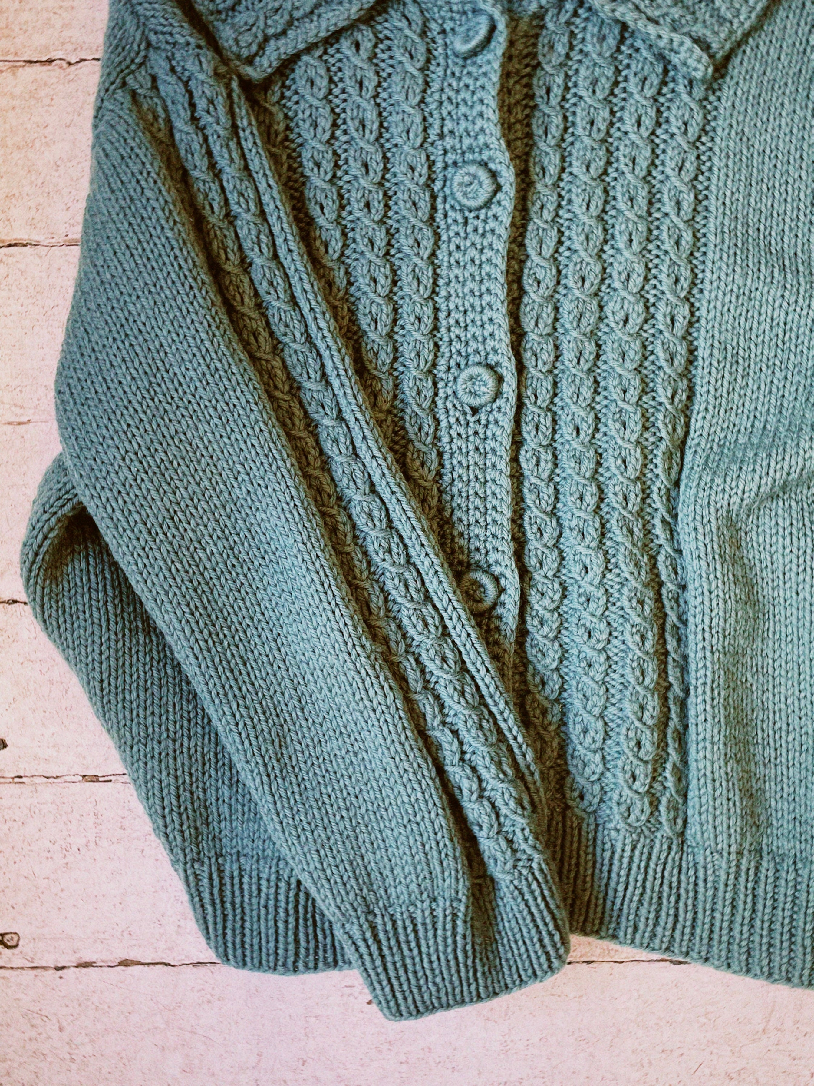 1960s vintage cardigan with peter pan collar. In a gorgeous teal/sea green wool with the most beautiful knitting pattern details. The cardigan has a nice intentionally oversized fit that makes layering easy. A one of a kind vintage piece.