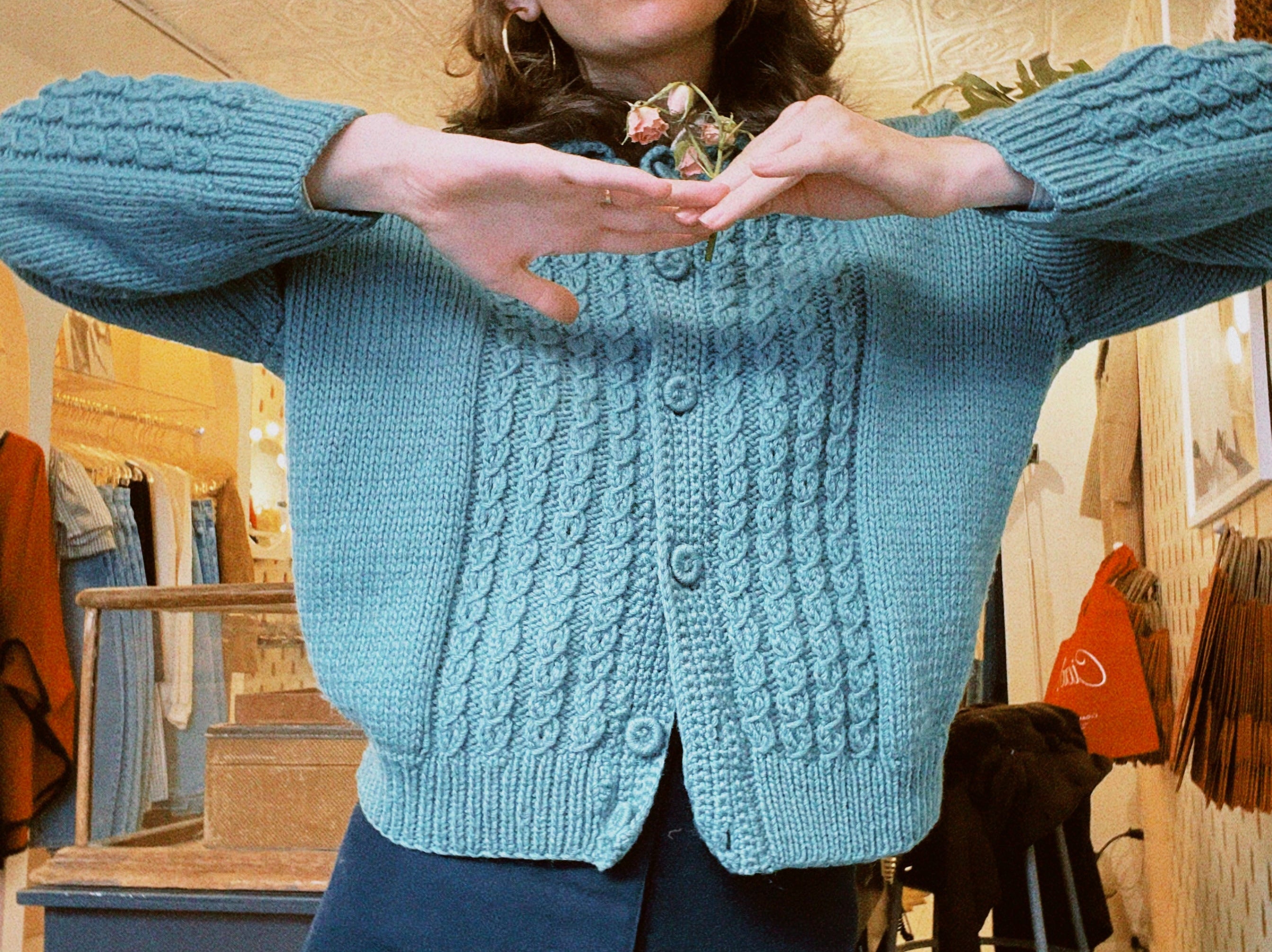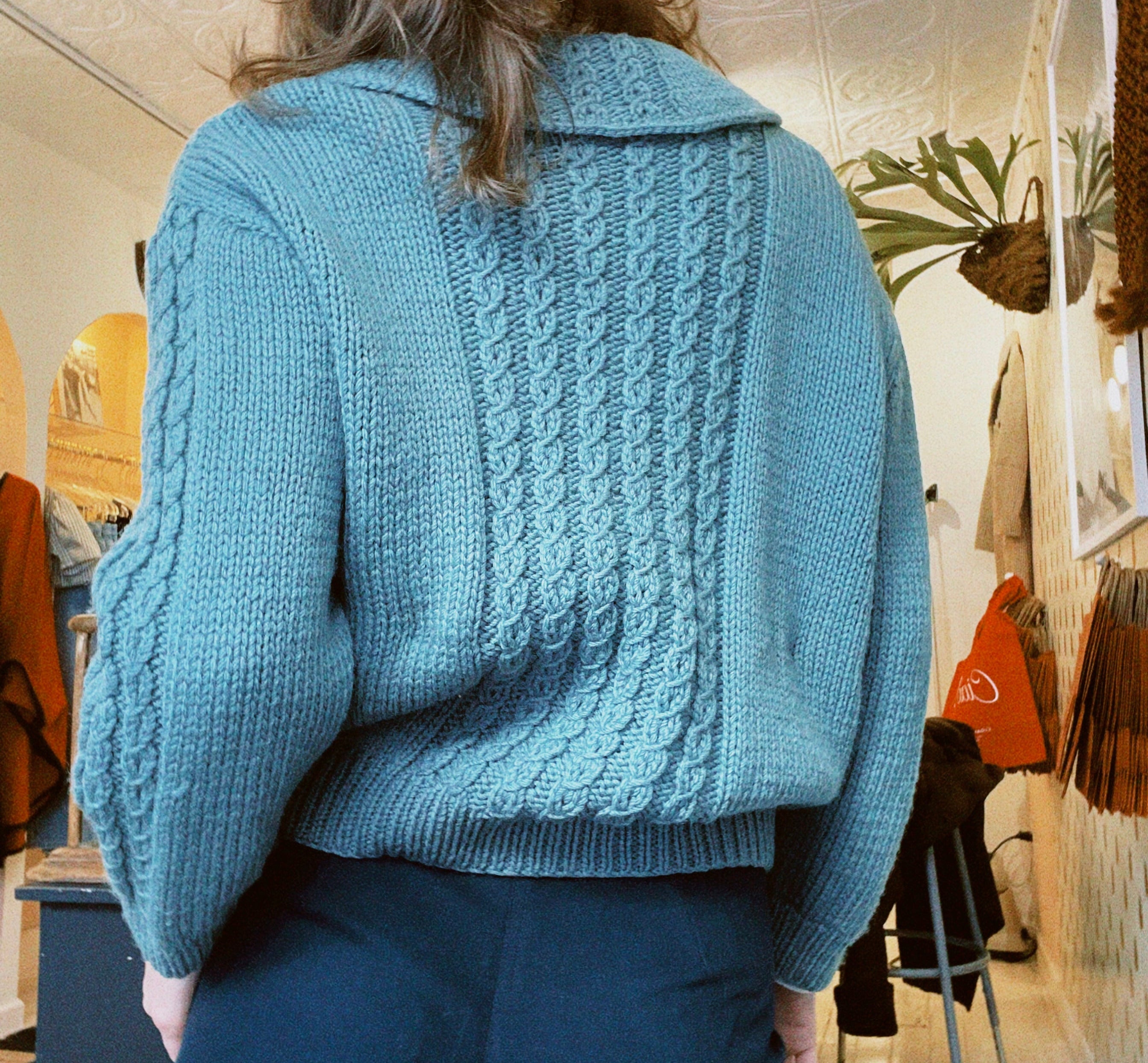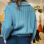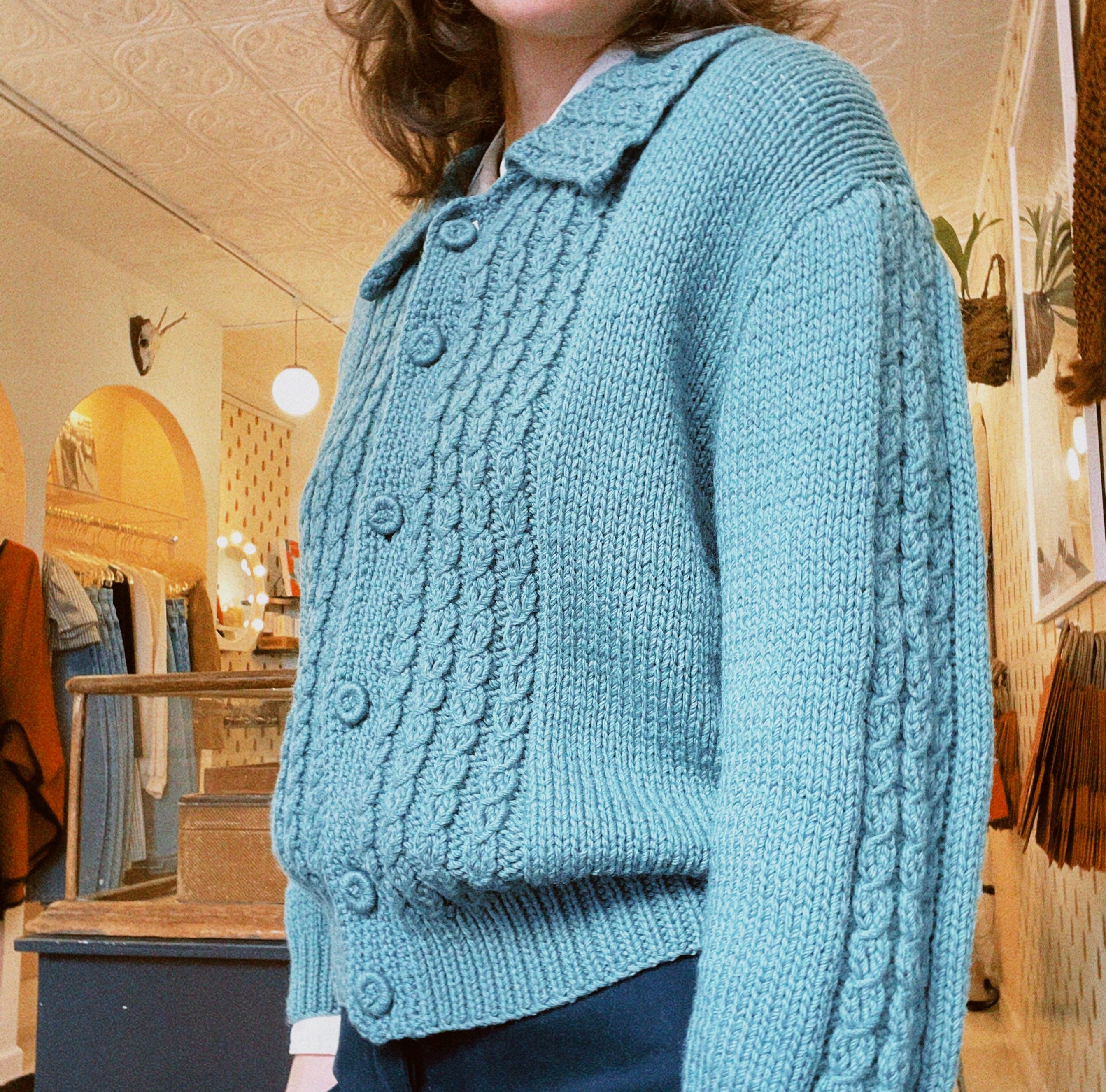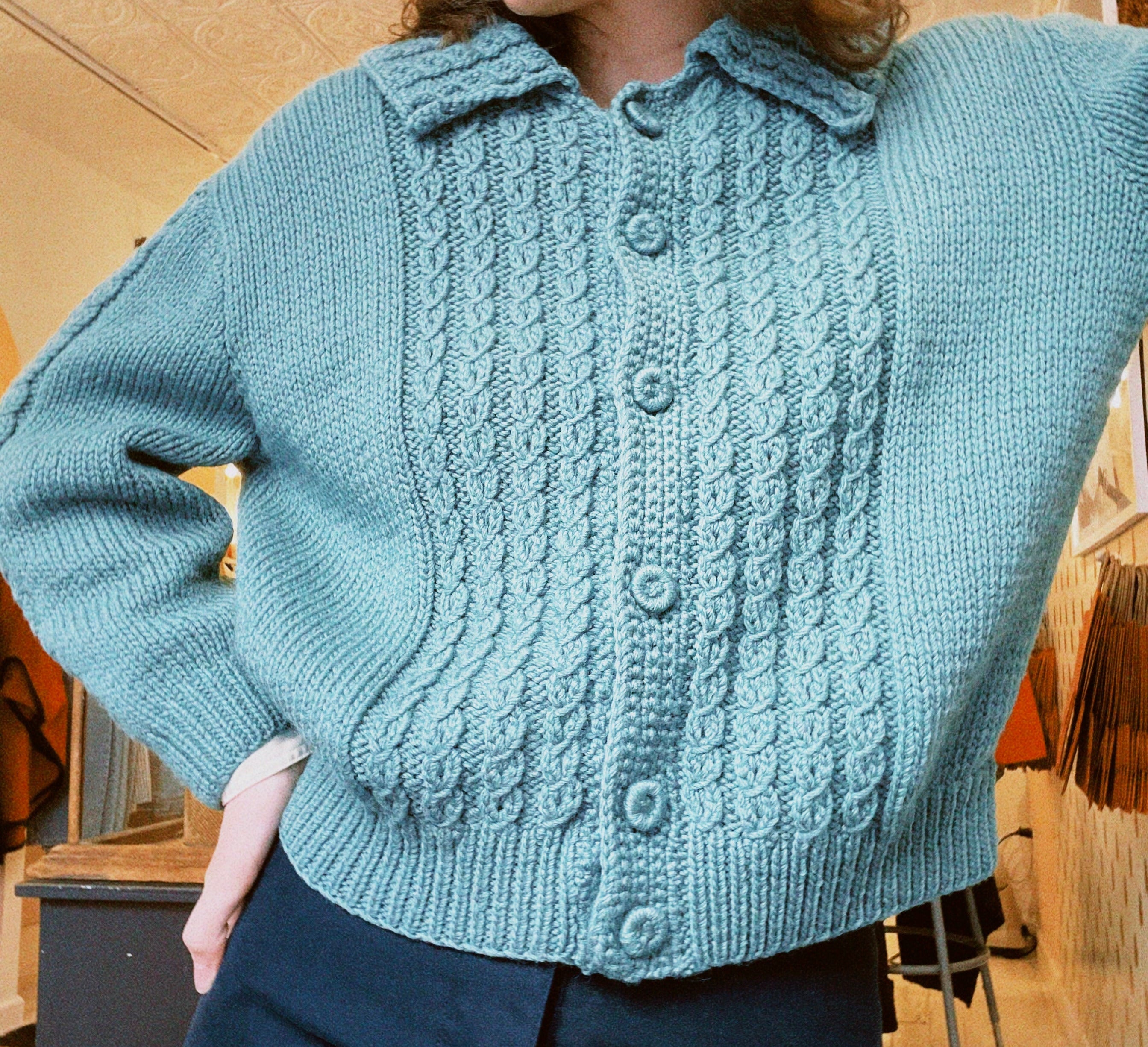 1960s vintage cardigan with peter pan collar. In a gorgeous teal/sea green wool with the most beautiful knitting pattern details. The cardigan has a nice intentionally oversized fit that makes layering easy. A one of a kind vintage piece.